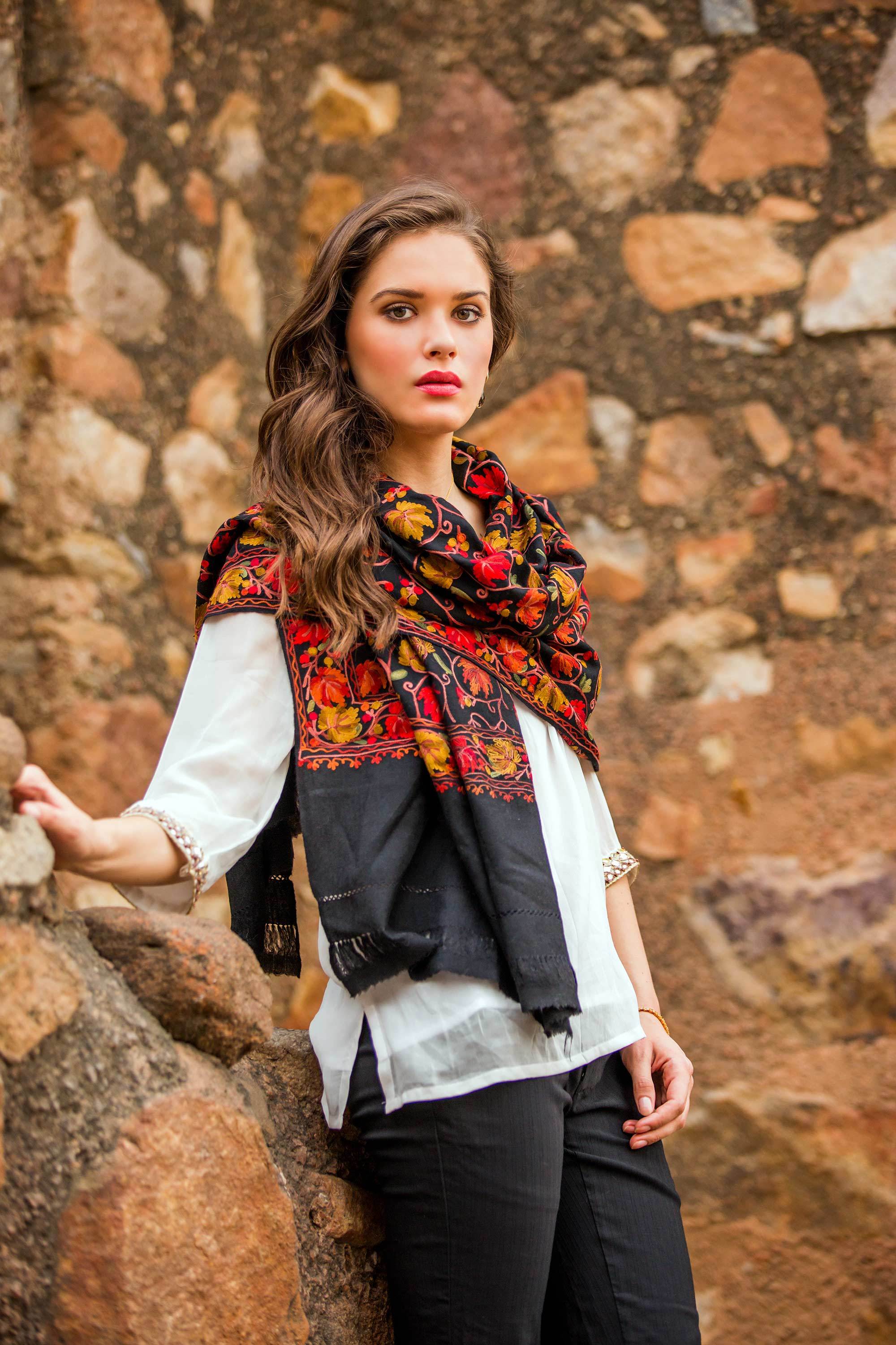 Midnight Mums: Artisan Made Floral Chain Stitch Embroidery Black Wool Shawl