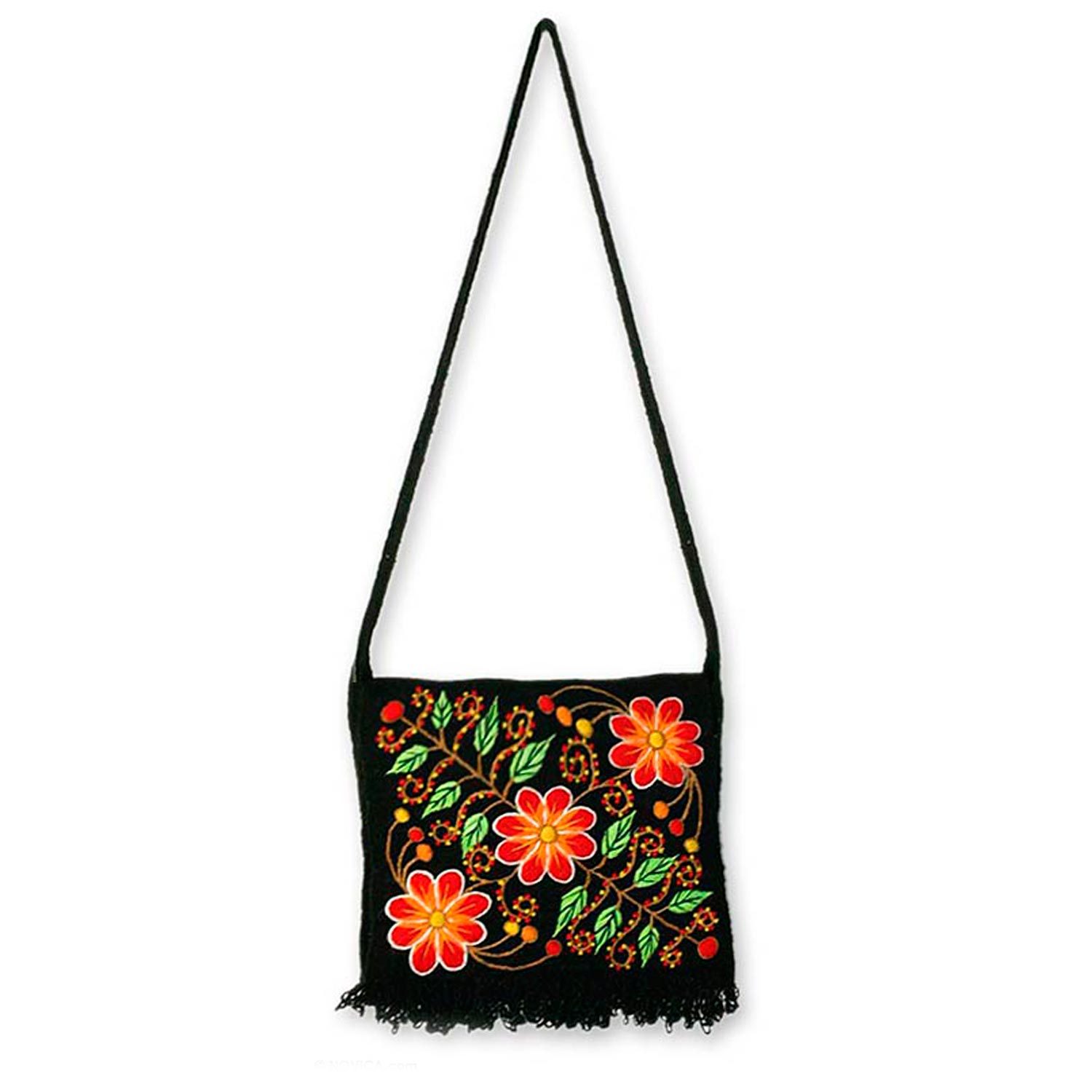 From the Garden Gathered: Artisan Black 100% Wool Shawl with Multi Colored