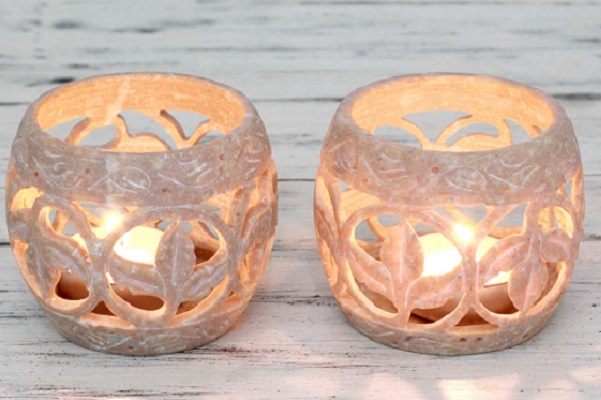 These gorgeous tea light artisan candleholders, aptly named ‘Tendril Tales’ would make beautiful accents for an outdoor dinner party, or for an intimate gathering indoors. They would be a nice gift to bring to the hostess, or she could surprise guests by sending some tea lights home with them at the end of the evening. If the hostess uses the tea lights at the party, the guests may perceive this as something belonging to her and may be resistant to accepting something they feel she should keep. Therefore, it may be a good idea to have unopened, and perhaps wrapped, sets to give to guests. These unique tea lights were carved by the artist Gulam Rasool of India.