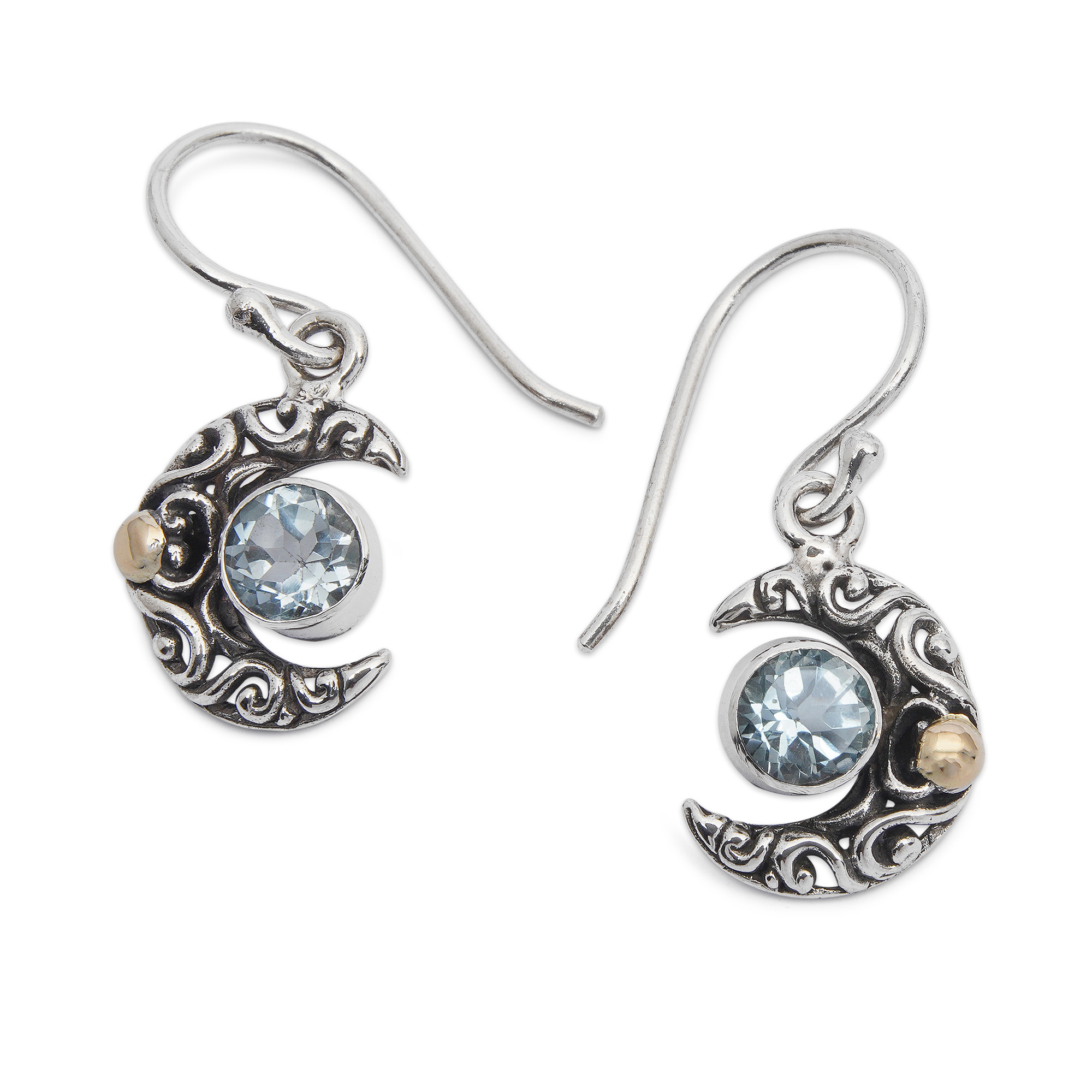 The moon takes the starry sky and paints the night with a blue hue of serenity. Inspired by a sudden vision, Balinese artisan Dewi Putera creates these sterling silver dangle earrings, whose folk art details compose an ethereal moon of 18k gold-plated accents. Faceted blue topaz jewels—totaling one carat—crown the pendants, symbolizing loyalty and peace.