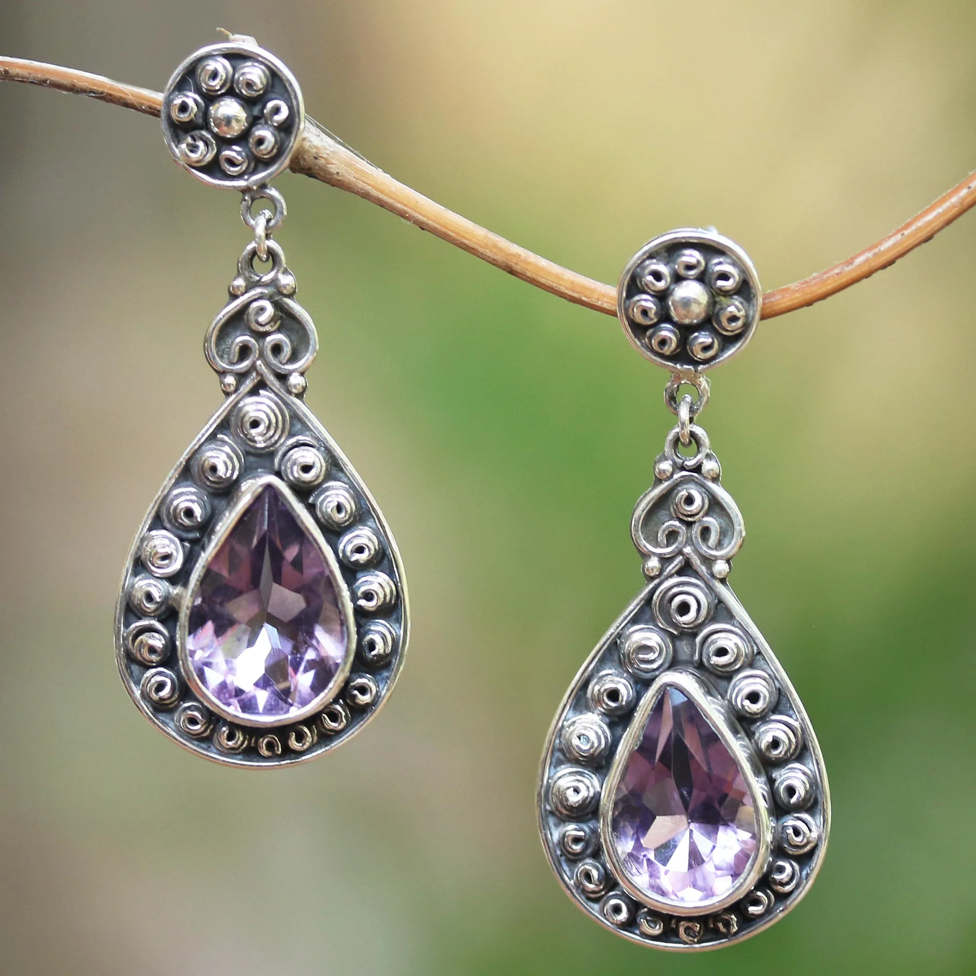 Framed by intricate sterling silver swirl patterns, two faceted amethyst teardrops total 10 carats. Rosalia Tarigan designs these dangle earrings, which are handcrafted by Javanese artisans.