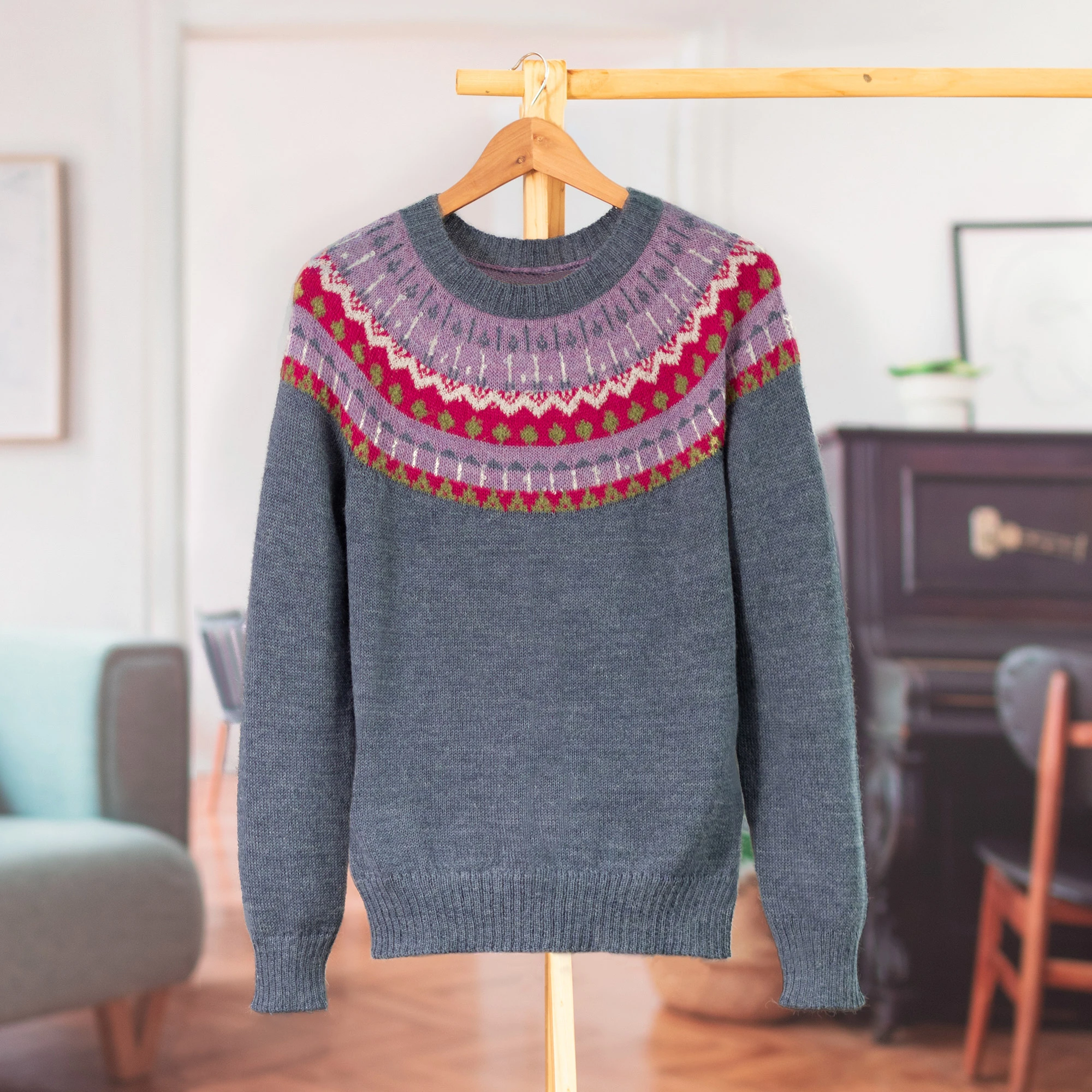 100% Alpaca Knit & Patterned Pullover Sweater in Steel Blue, 'Winter Skyline'