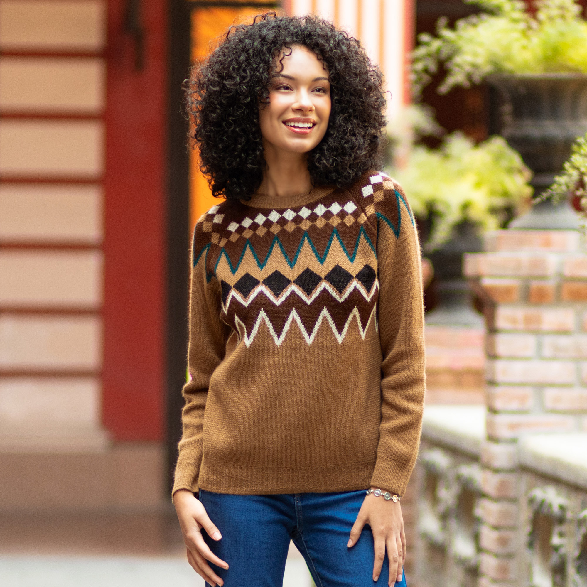The bold, but not overly so, geometric designs on this pullover draw the eye up towards your face. Created in 100% alpaca by Anaychay of Peru, this sweater is both soft and warm, and will be a favorite all winter. Once reserved for Inca royalty, alpaca is extremely warm yet lightweight.
