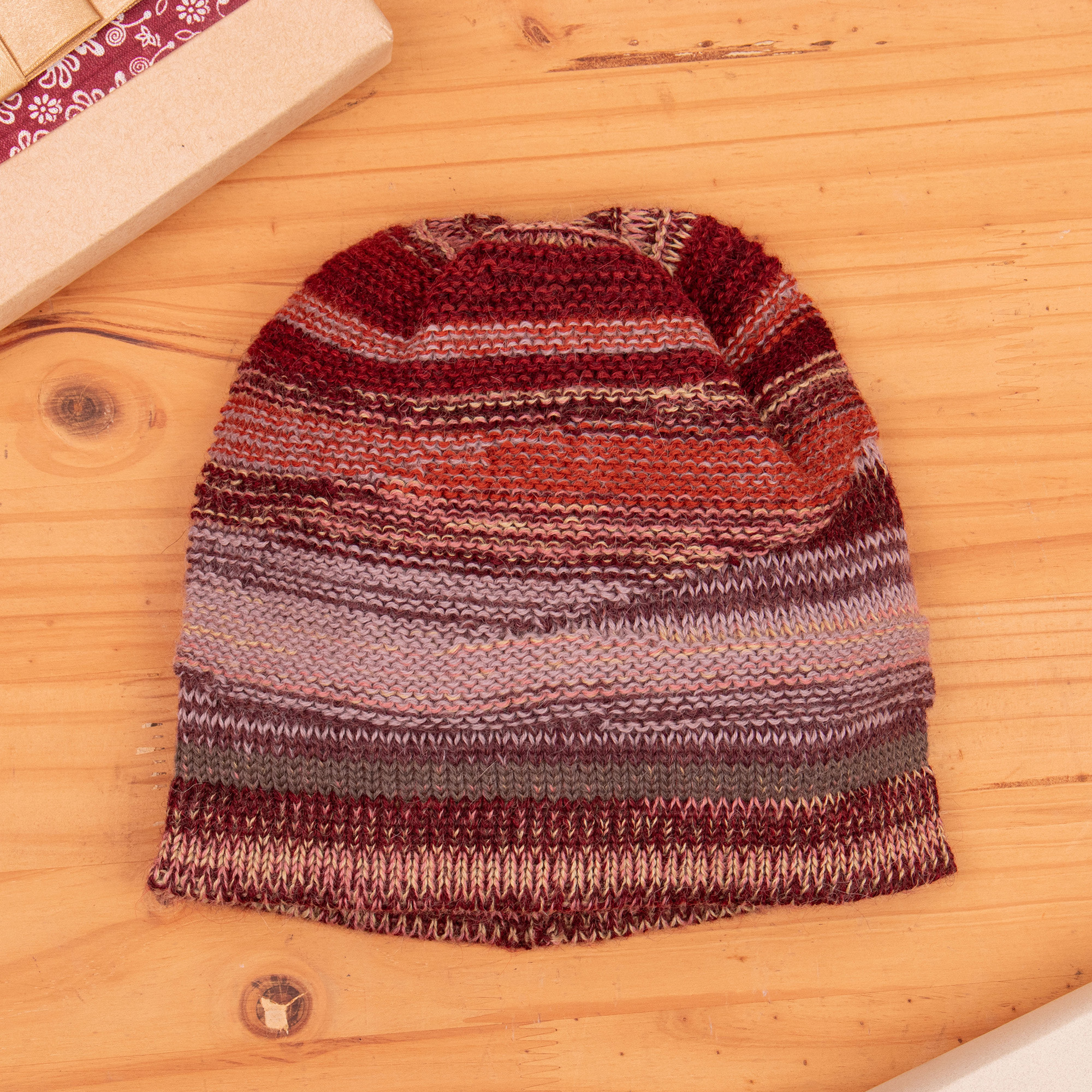 A luxuriously soft alpaca hat combines rich burgundy, purple and pink hues in an intricate textured pattern that captures winter's bold spirit. This chic cold-weather companion, designed by Peru's Ana Fernandez, transforms practical warmth into a striking style statement.