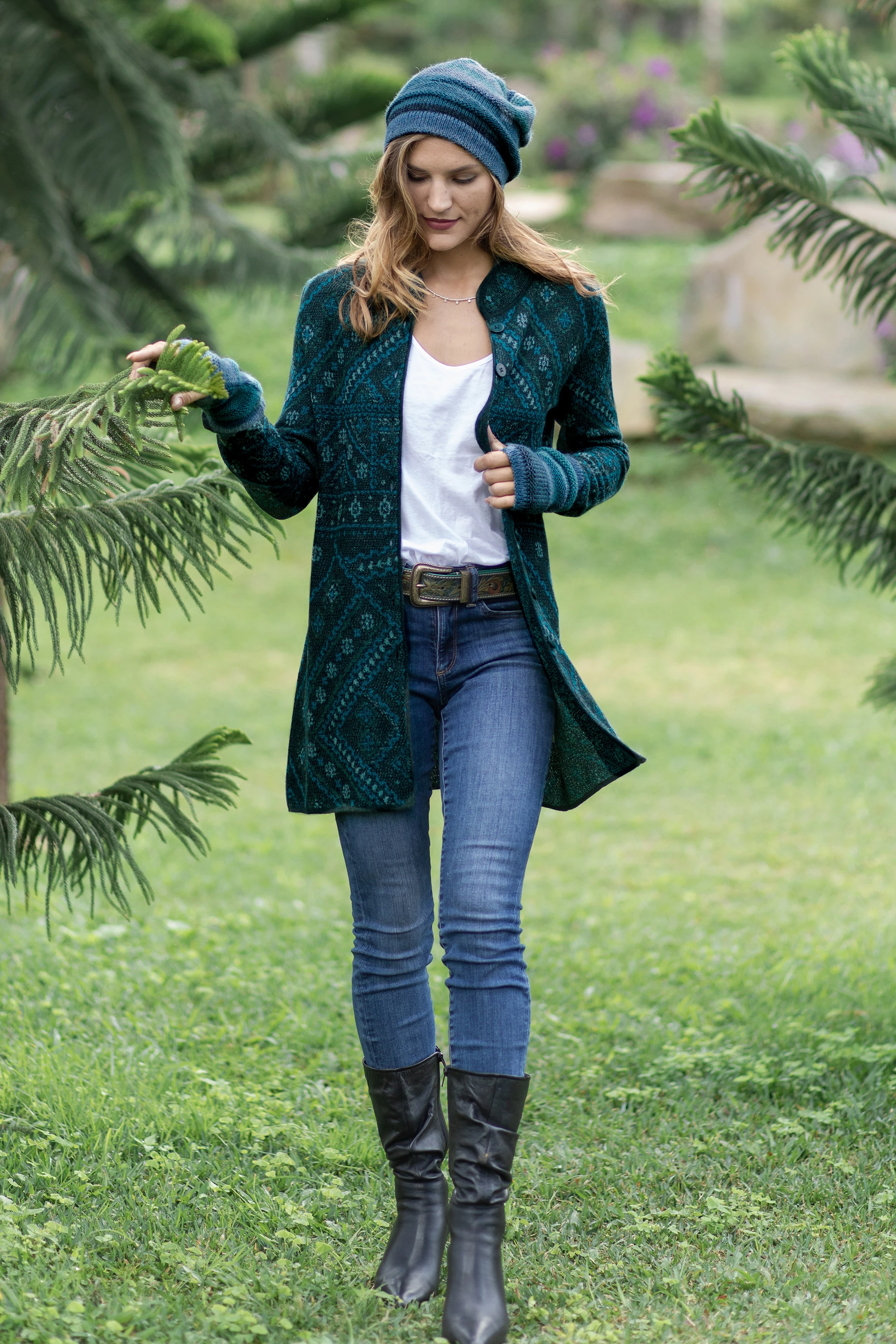 100% Baby Alpaca Green Long Cardigan with Mandarin Collar, 'Nordic Chic in Forest'