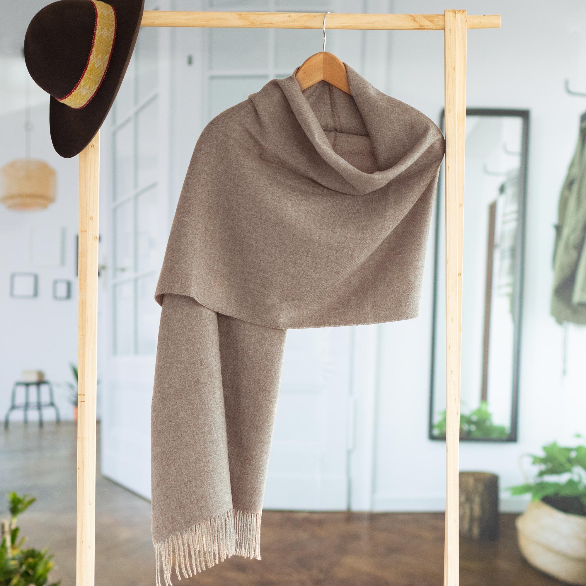 Simple in its design, yet stunning in its beauty, this authentic Peruvian shawl is sure to turn heads wherever it goes. Nataly and Alberto present an accessory for keeping warm during the cold moths. This shawl is woven from 100% baby alpaca wool in taupe with fringe accentuating the ends. Baby alpaca refers to the fine fleece from the season's first shearing. This shawl's width allows it to double as a wrap scarf.