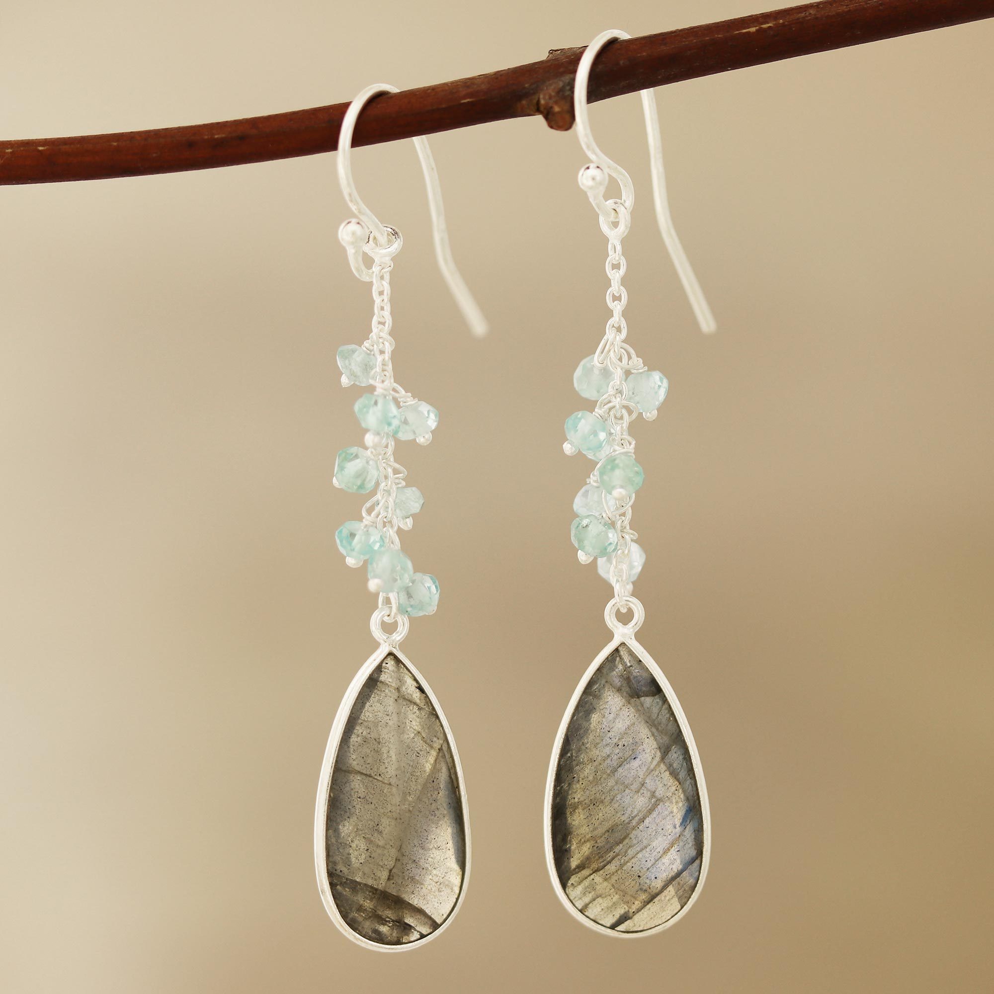 Neetu Barathi designs a pair of dangle earrings that evokes the sky during the evening. Two faceted teardrops of natural labradorite total 12 carats, displayed below clusters of blue topaz beads. These earrings are handcrafted with sterling silver.