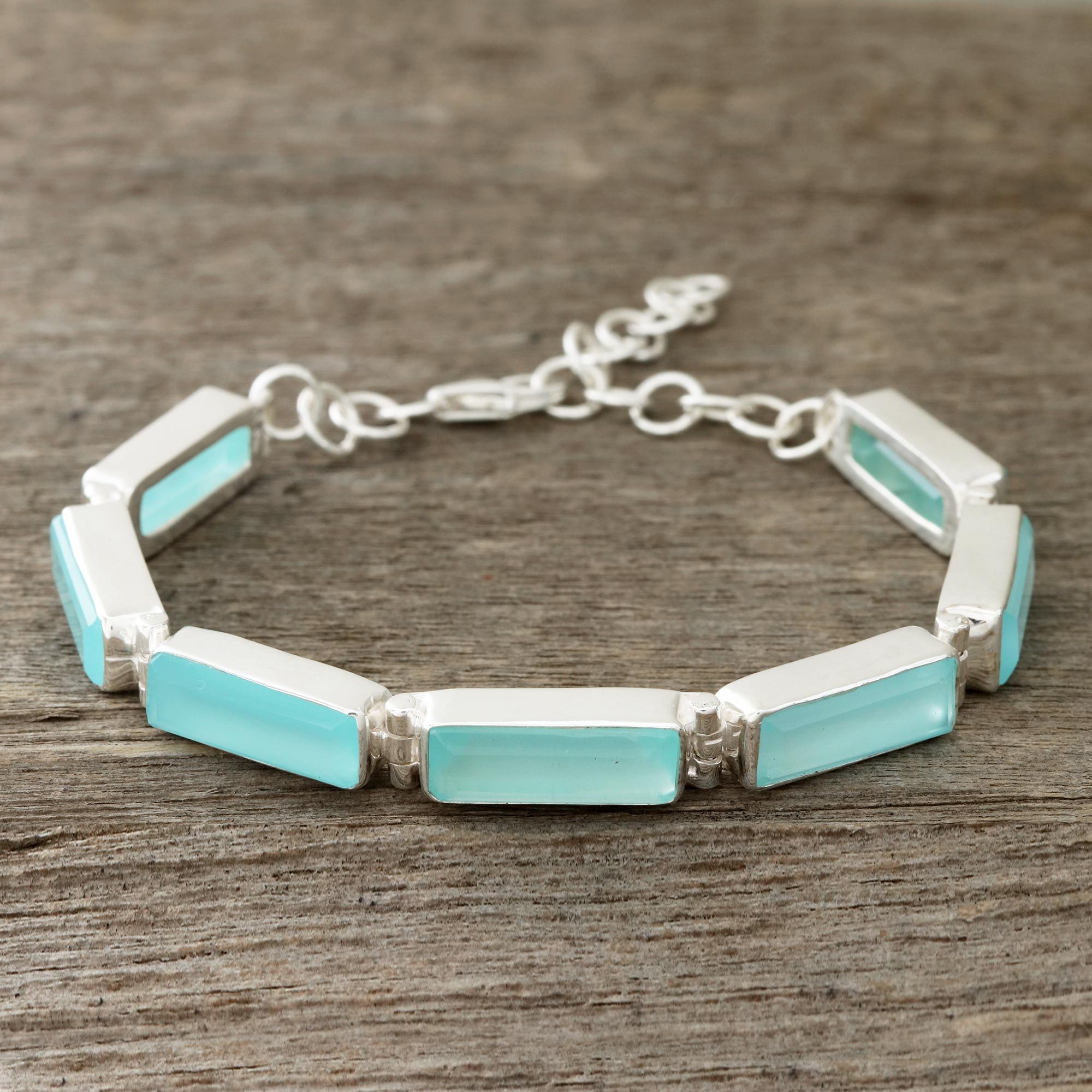 With fascinating hues of blue, faceted gemstones of chalcedony total a sumptuous 14 carats. Neetu Barathi designs this Indian link bracelet, which frames the stones with high-polish sterling silver.