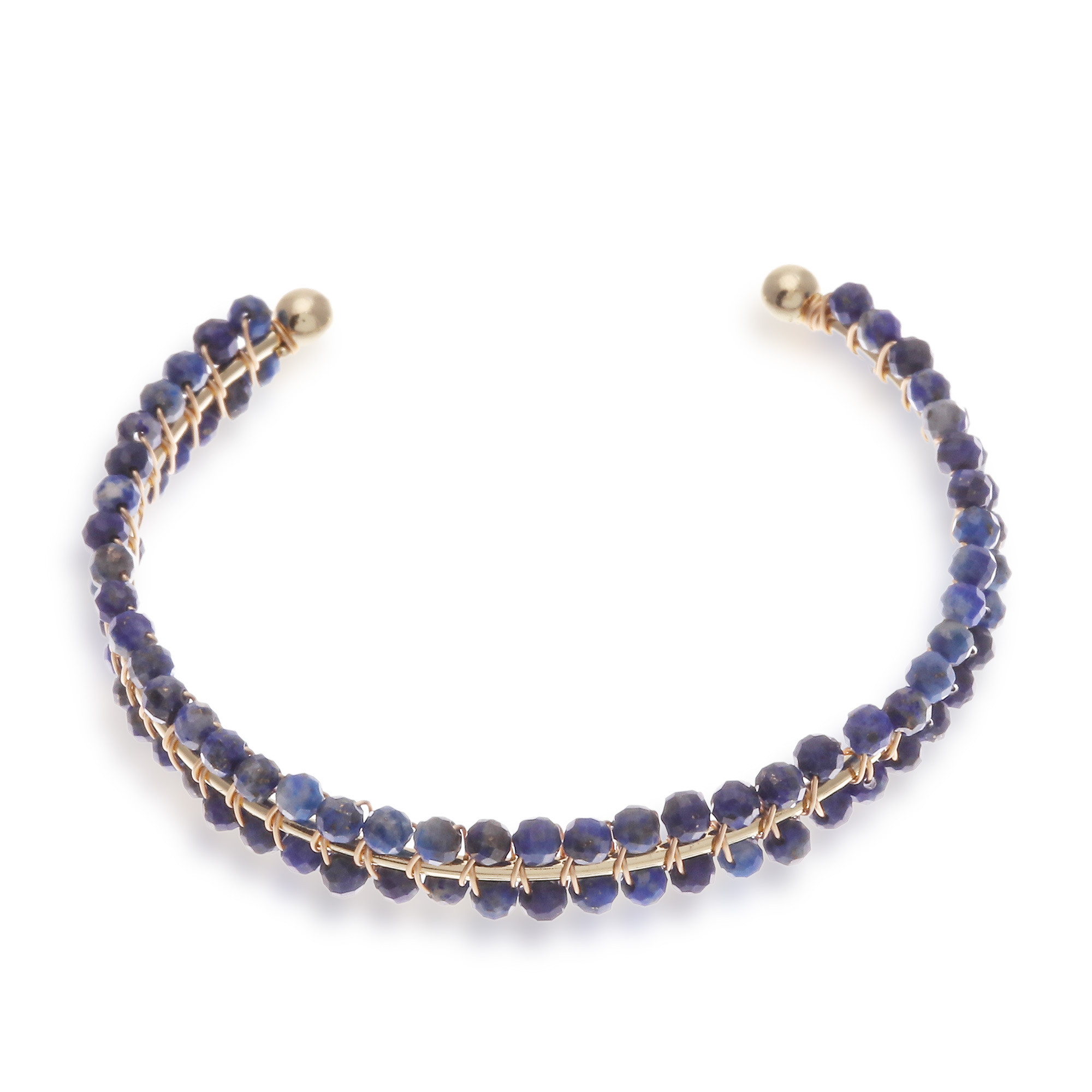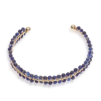 An 14k gold-plated cuff bracelet bursts to life with a cluster of hand-threaded lapis lazuli stones, their breathtaking color contrasted by the intricate weave of copper wire. Thai artisan Nareerat's meticulous craftsmanship brings a unique harmony to this bracelet, making it a distinctive piece for any collection.