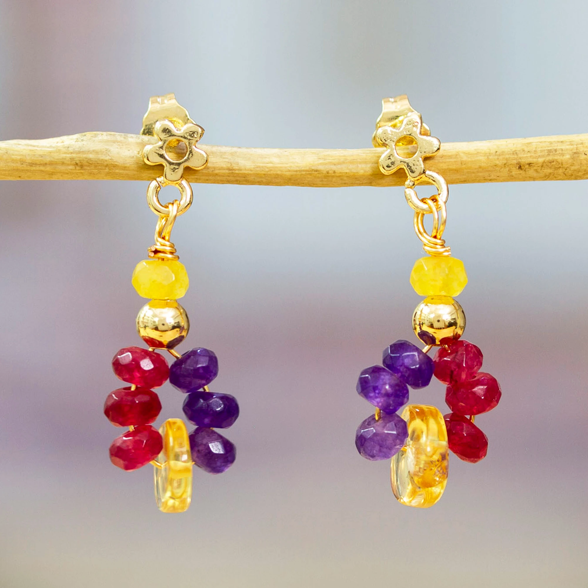 Vibrant and intense hues decorate this chic design from Mexican lands. Artisan Alejandra Aceves displays artistry in these dangle cluster earrings crafted from agate and citrine jewels, all gracefully arranged in a 14k gold-plated structure enriched by a glorious high-polish finish.