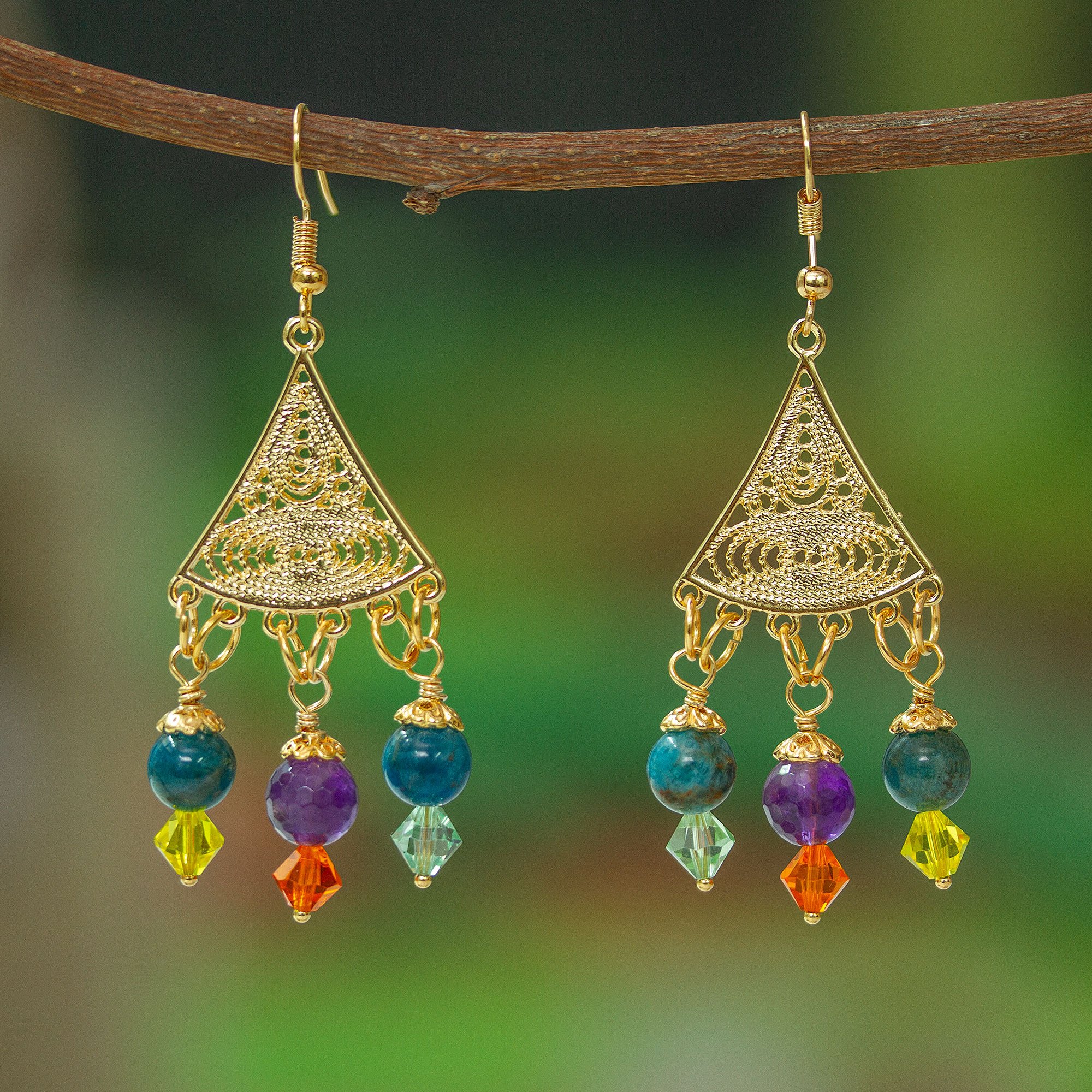 Exotic colors and delicate filigree details compose an ode to spring, crafted by master artisan Alejandra Aceves. Inspired by Mexico's high-quality jewelry traditions, the artisan creates these 14k gold-plated dangle earrings, embellished with amethyst, agate and colorful Swarovski crystals.