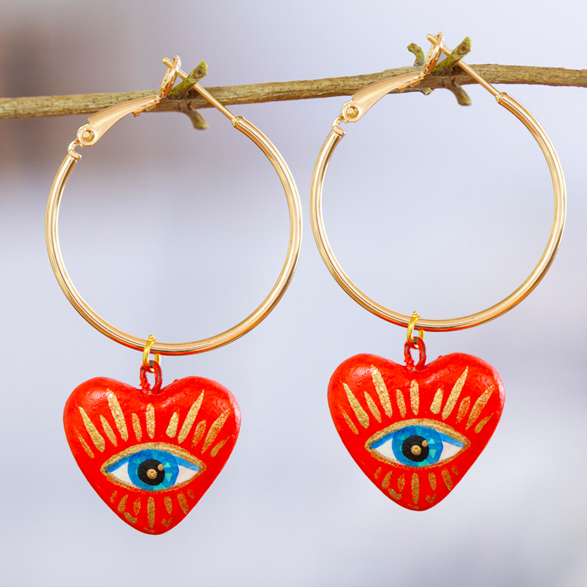 Full of love and passion, these 14k gold-plated hoop earrings are a romantic creation handcrafted by Mexico's Edith Orozco. The centerpieces are hearts made from papier mache, with intense eyes painted over, symbolizing desire.