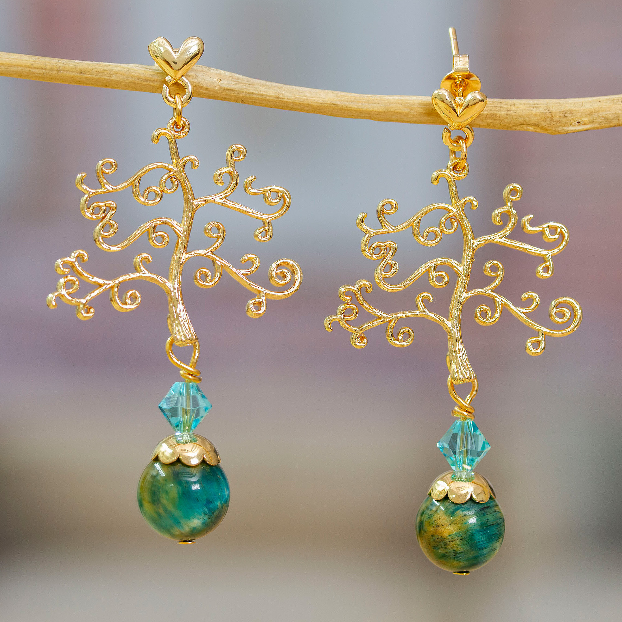 Let your spirit grow as prosperous and majestic as the tree that embellishes a pair by Alejandra Aceves. The Mexican artisans draw inspiration from nature to create these 14k gold-plated dangle earrings, whose high-polish finish creates an enchanting look. The pieces are crowned with tiger's eye stones and Swarovski crystals, symbolizing harmony and vitality.