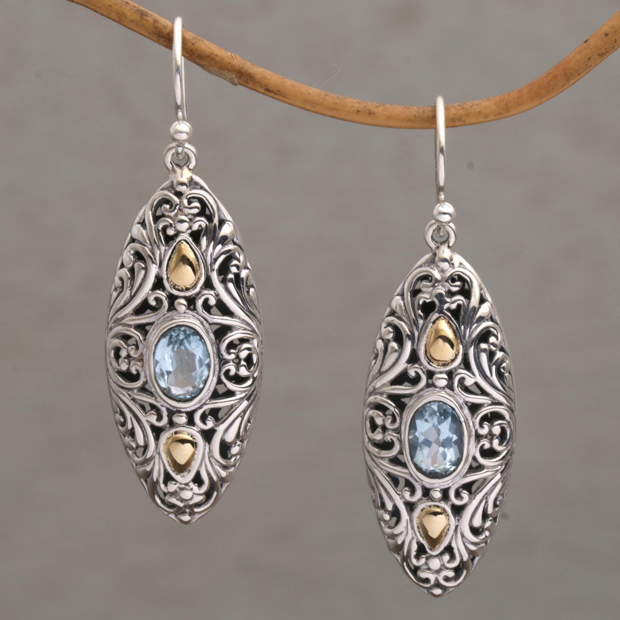 18k Gold Accent Blue Topaz Dangle Earrings form Bali, 'Shields of Vines'