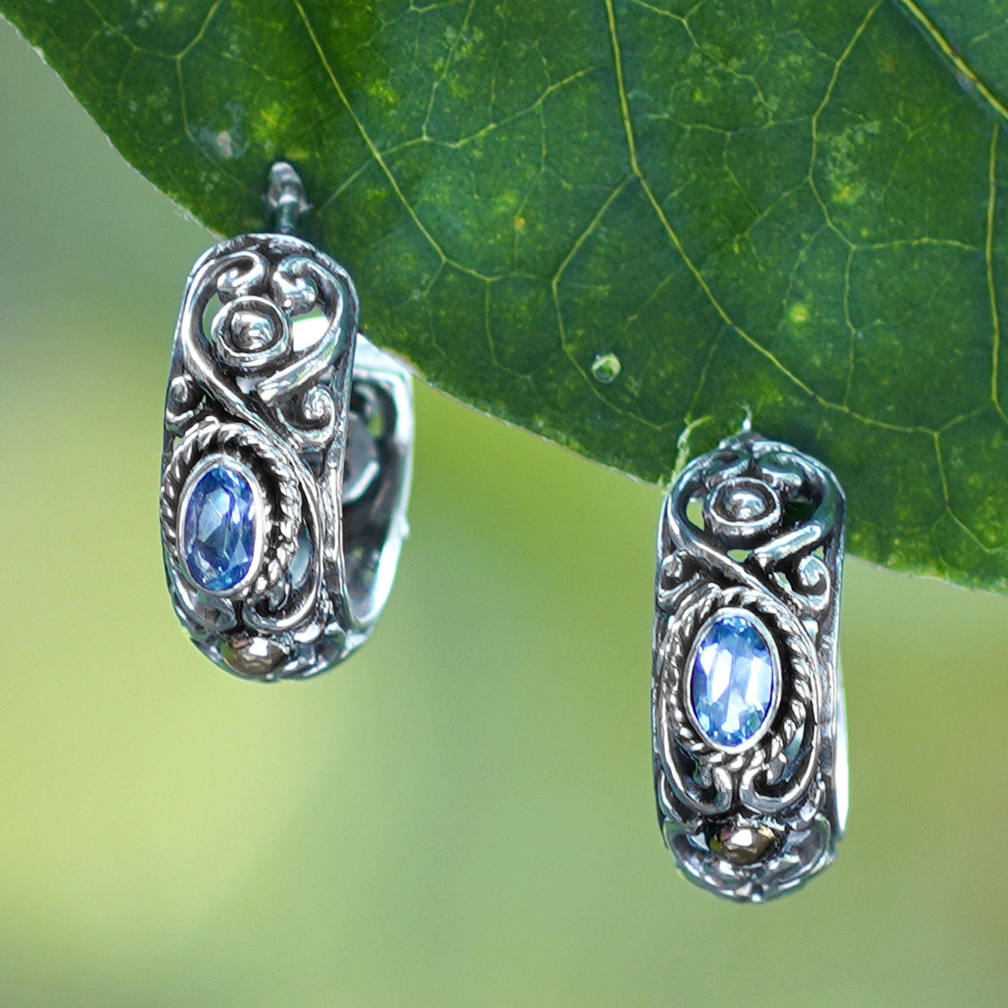 Sterling silver becomes a canvas for traditional Balinese patterns and exquisite openwork details in these gorgeous half-hoop earrings by Dewi Putera. The varied finish techniques create a rich topography across each earring's surface enhanced by blue topaz gemstones that add vibrant color variations to the metalwork. Touches of 18k gold plating serve as connecting threads throughout the design, unifying the different elements while adding warmth that complements the inherent coolness of the silver base.