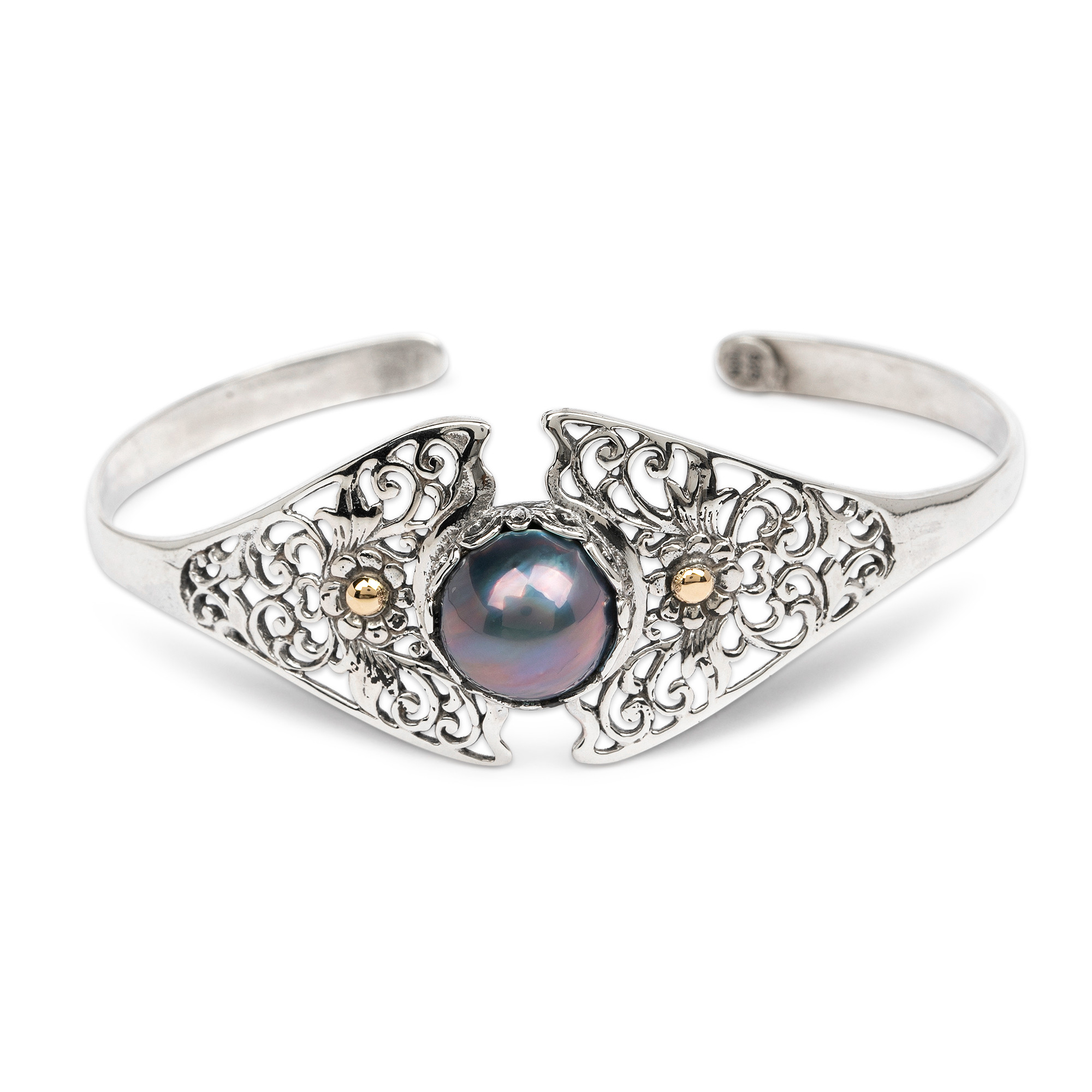 From the skilled hands of Bali's Dewi Putera comes a sterling silver cuff bracelet that exudes sophistication. An exquisite cultured mabe pearl, intricate openwork details with floral and vine designs and delicate gold-plated accents make this accessory an instant favorite.