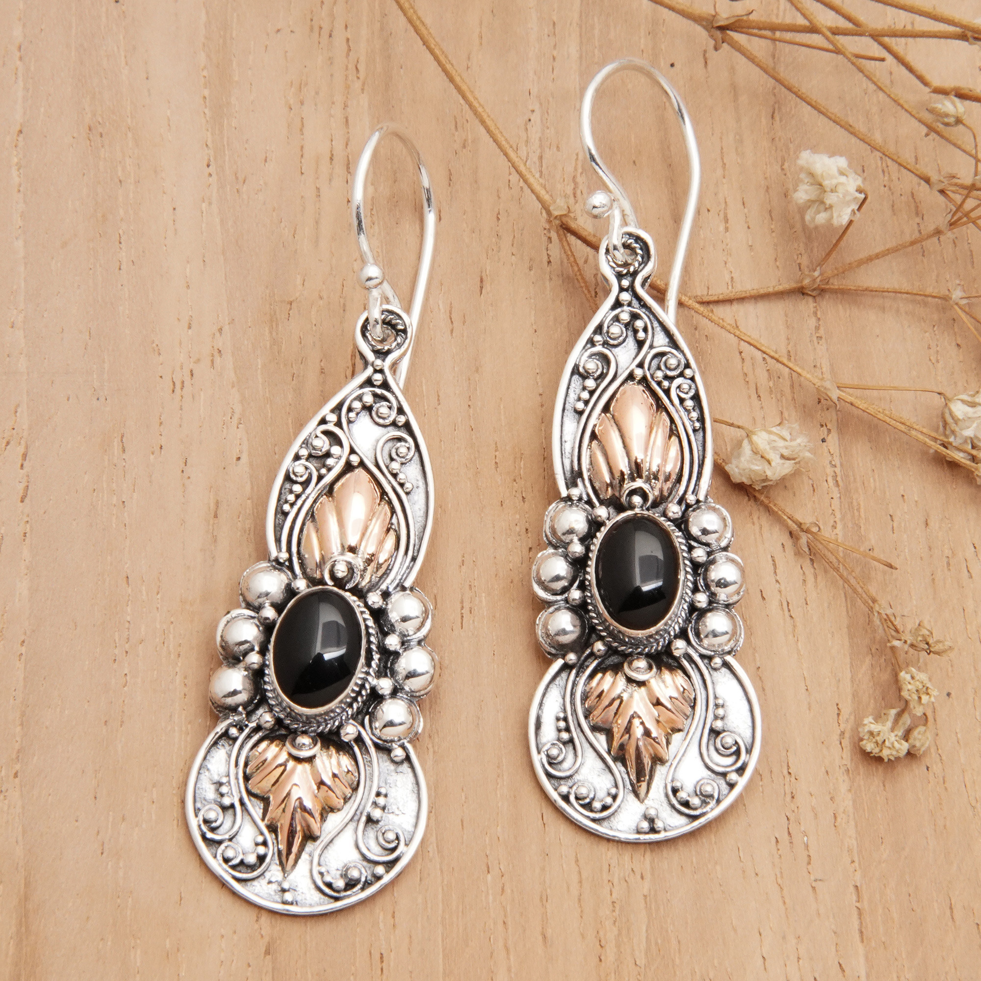Flames of elegance and tradition surround a sublime creation from the ancient lands of Bali. Crafted by local artisans, Sukartini's newest dangle earrings feature polished structures with little beads and swirling motifs made from sterling silver. Then, as sophisticated details, 18k gold-plated accents enhance windy formations reminiscent of flames, enriching the beauty of the onyx cabochons at the center, symbols of protection.