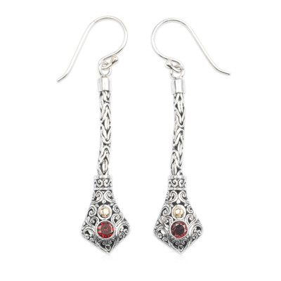 18k Gold-Accented Garnet Silver Dangle Earrings from Bali, 'Balinese Wonders'