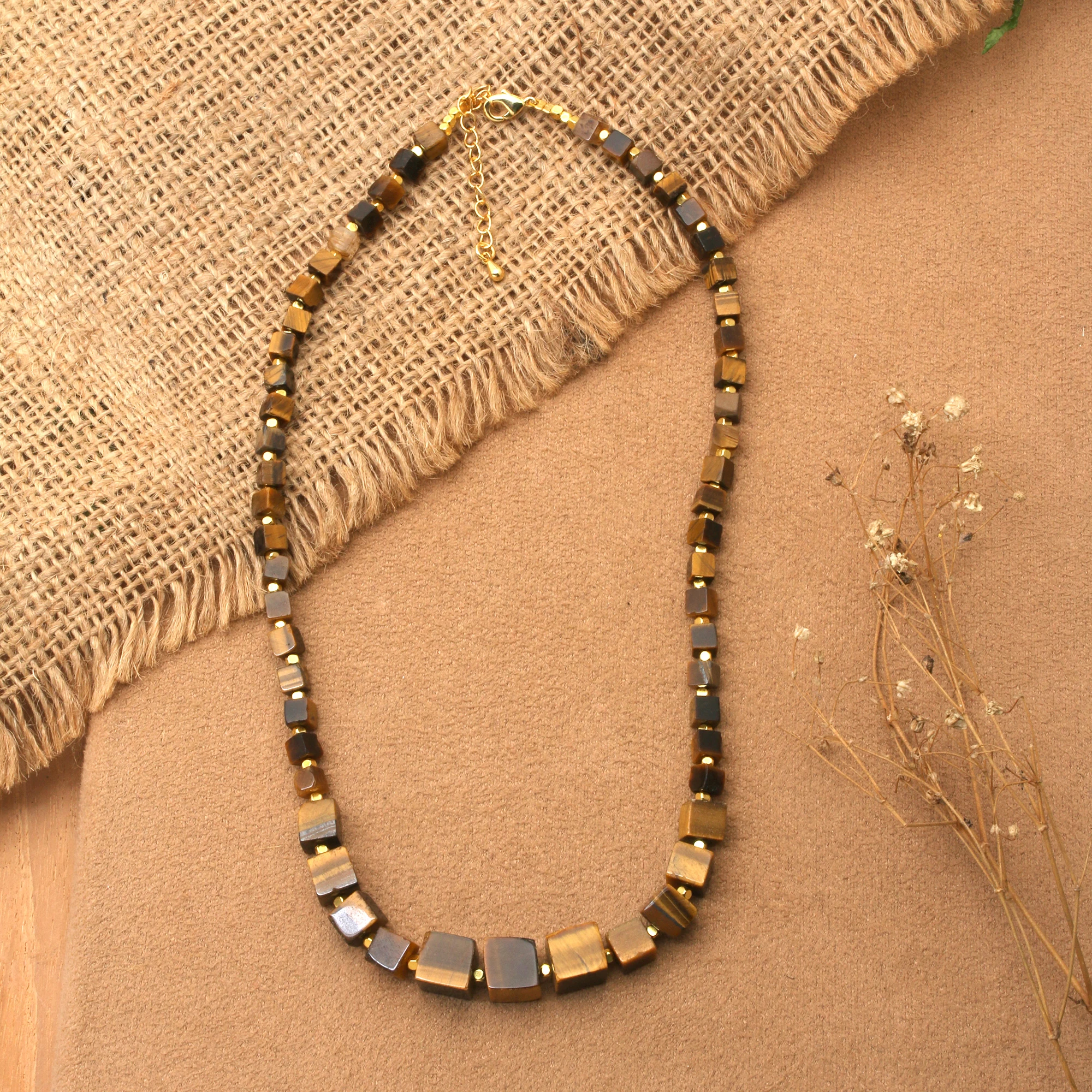 Earthy sophistication meets golden hour glow in this stunning beaded pendant necklace designed by Bali's Ayu Widiani. Each polished tiger's eye cube carries nature's own artistry, with silky bands of caramel, cream and rust–evoking desert sands–that give the stone its unique character. The graduated design draws the eye from delicate smaller beads to more substantial stones at the center, creating a flattering flow that sits beautifully at the collarbone. Tiny 18k gold-plated brass beads punctuate the strand with warm metallic sparkle, while the gold-plated clasp and adjustable extender chain ensure this necklace fits as perfectly as it photographs.