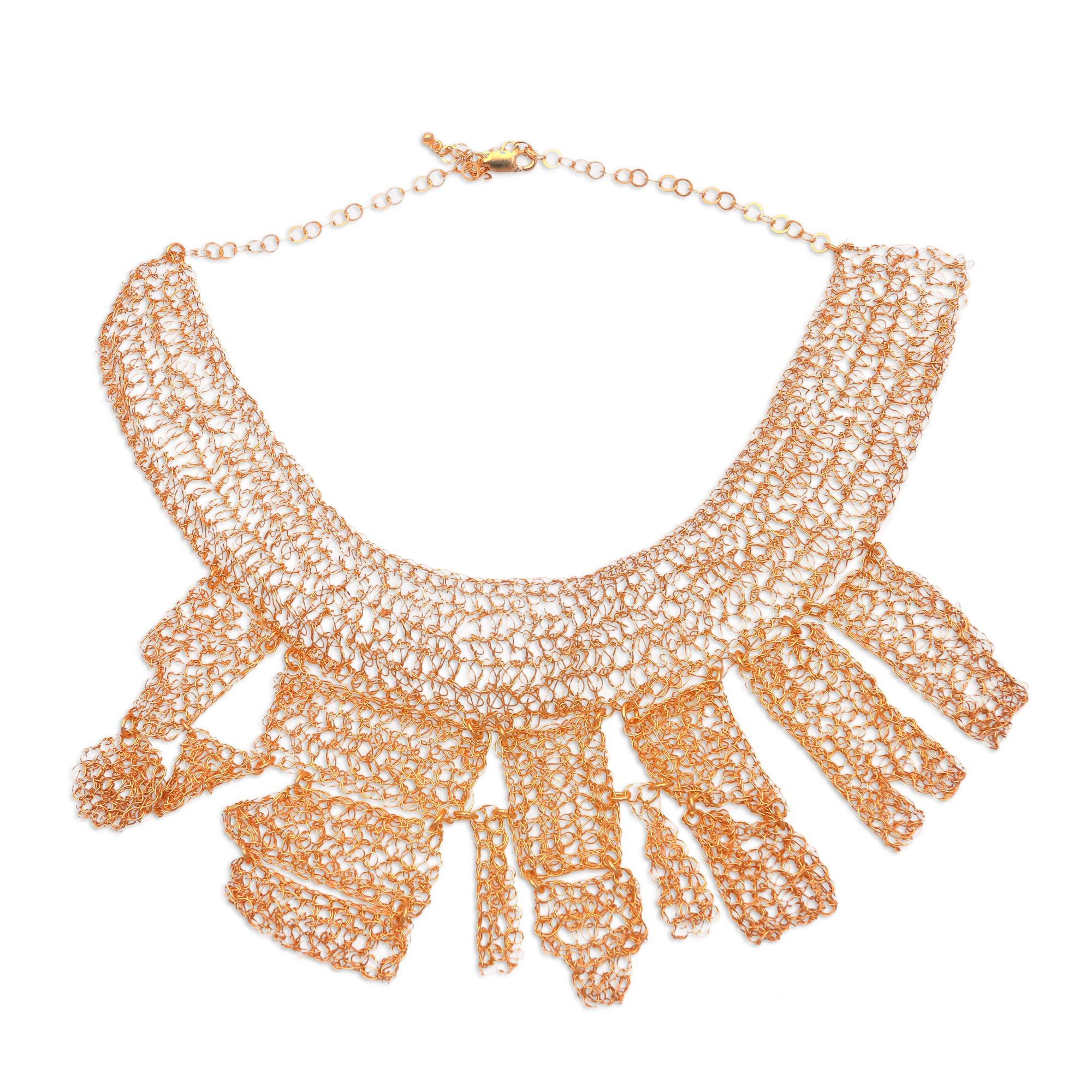 Glistening beautifully, 18k gold plated copper wire is used to hand-weave this statement necklace from Bali. The choker-style necklace is centered by a cascade of pendants that form a wide collar. A gleaming bauble dangles from the clasp.