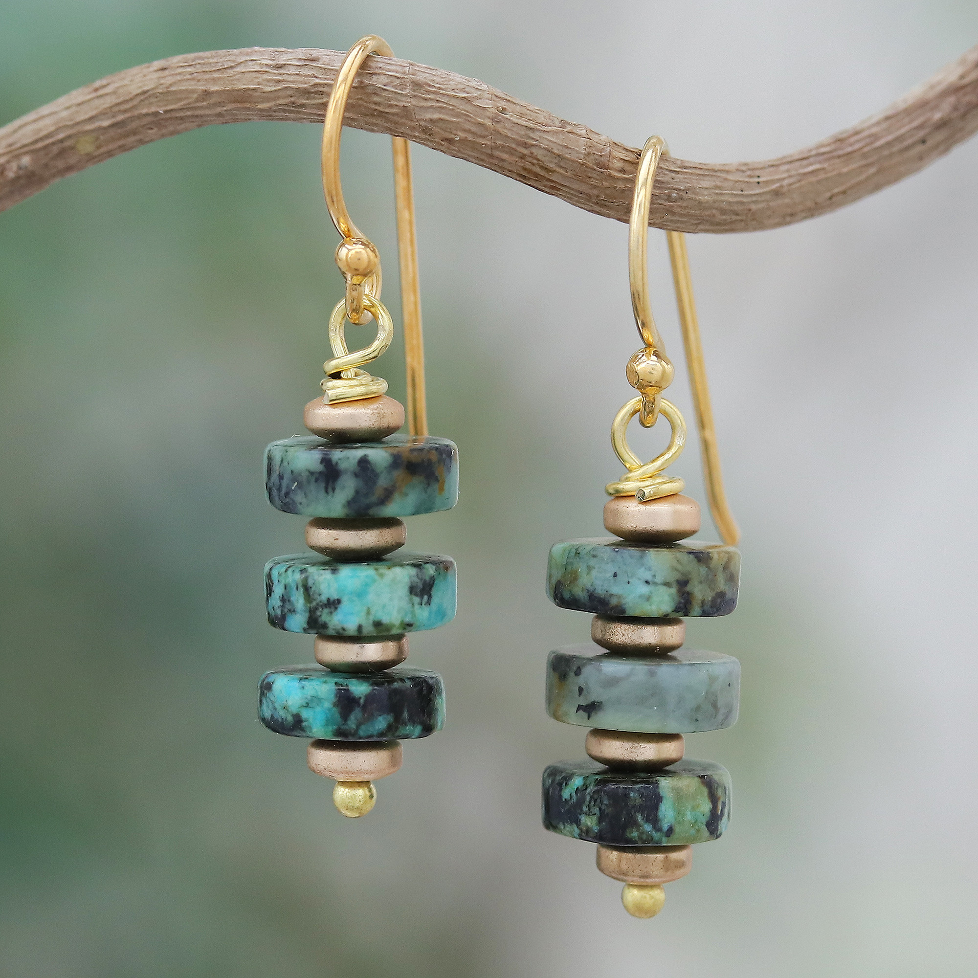 Gold accents add a sleek aura to Sareeyakarn's newest design, crafted with little hematite gems believed to keep negative energies away. The Thai artisan also complements these dangle earrings with reconstituted turquoise jewels in a dapper hue reminiscent of the sea. On top of that, the accessory comes with hooks for a comfortable fit.