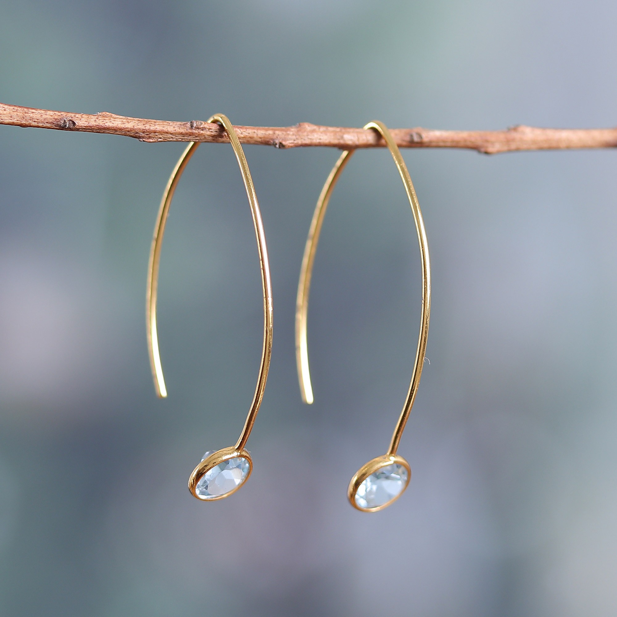 Made with mysterious elegance, Indian artisan Shivani Choudhary's 18k gold-plated drop earrings feature a sophisticated aura thanks to their avant-garde design and high polish finish. As a magical touch, faceted blue topaz jewels crown the accessories, shining with radiant light and totaling over one carat.