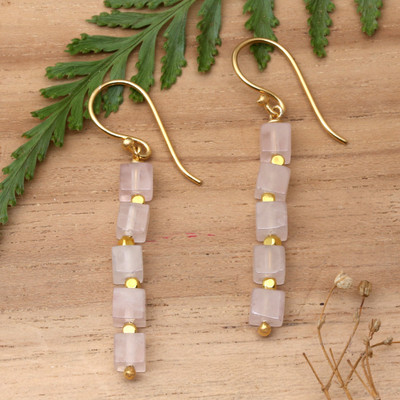Delicate rose quartz cubes in blush pink tones that seem to glow from within adorn your ears with irresistible charm. Balinese artisan Ayu Widiani's dangle earrings pair five graduating gemstone beads with tiny 18k gold-plated brass accents, creating a gentle cascade that moves beautifully with every turn of your head. The pale rosy hues feel like wearing a love letter, bringing tender warmth to any outfit from brunch dates to garden parties.