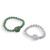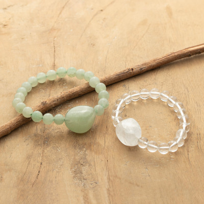 Some stones have a way of making you feel like you found them, not the other way around. Designer Swasti Jain from India pairs two stretch bracelets side by side, each built around a single tumbled focal stone that anchors its strand with quiet, organic authority: a smooth aventurine pendant nestled among soft green beads and a frosted quartz nugget glinting through a circle of glassy, transparent spheres. Worn together, the two play off each other beautifully, one grounded and mossy, the other light and almost weightless. Slip them both on and let the stones settle where they may.