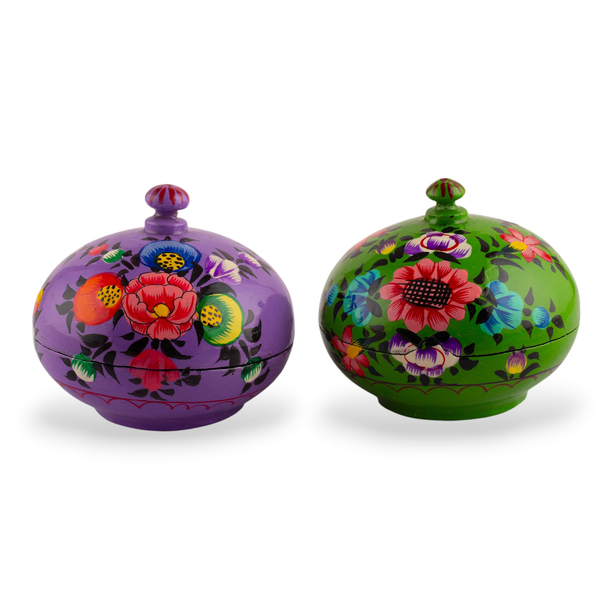 Joyful, unapologetic and impossible to ignore, this pair of hand-carved weeping willow decorative boxes throws every rule about restraint straight out the window. In Indian artisan Mohammad Hussain Baba's vibrant design, violet and grass green grounds serve as the stage for explosively hand-painted floral and leaf motifs in lively shades, the whole spectacle locked in under a high-gloss lacquer finish that keeps each brushstroke as vivid and alive as the moment it was made.