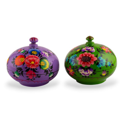 2 Botanical-Themed Wood and Papier Mache Decorative Boxes, 'Magical Spring'