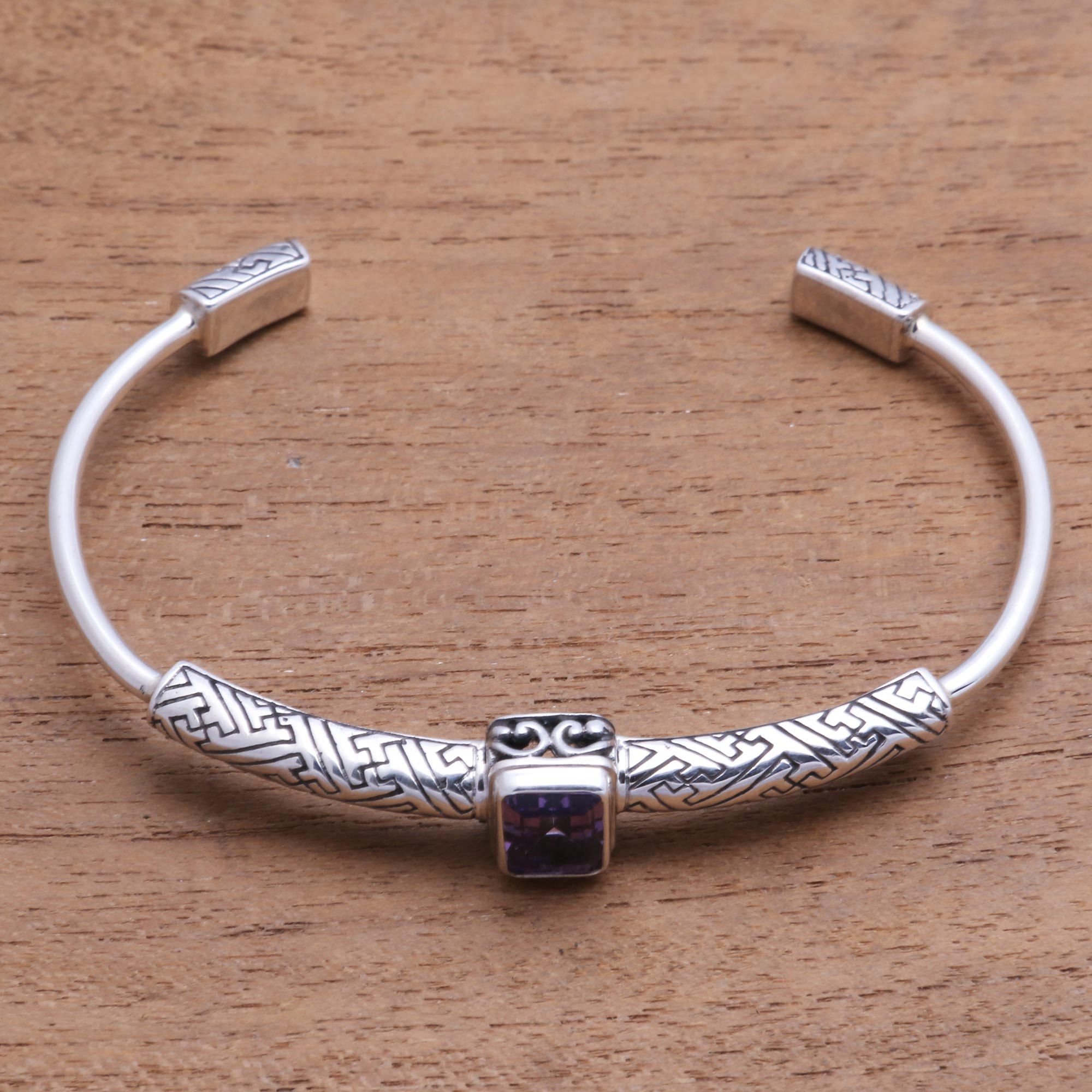 A delight of the imagination, this cuff bracelet flanks a two-carat amethyst gemstone with geometric patterns in combination-finish sterling silver. Wayan Neri designs this wonderful bracelet from Bali.