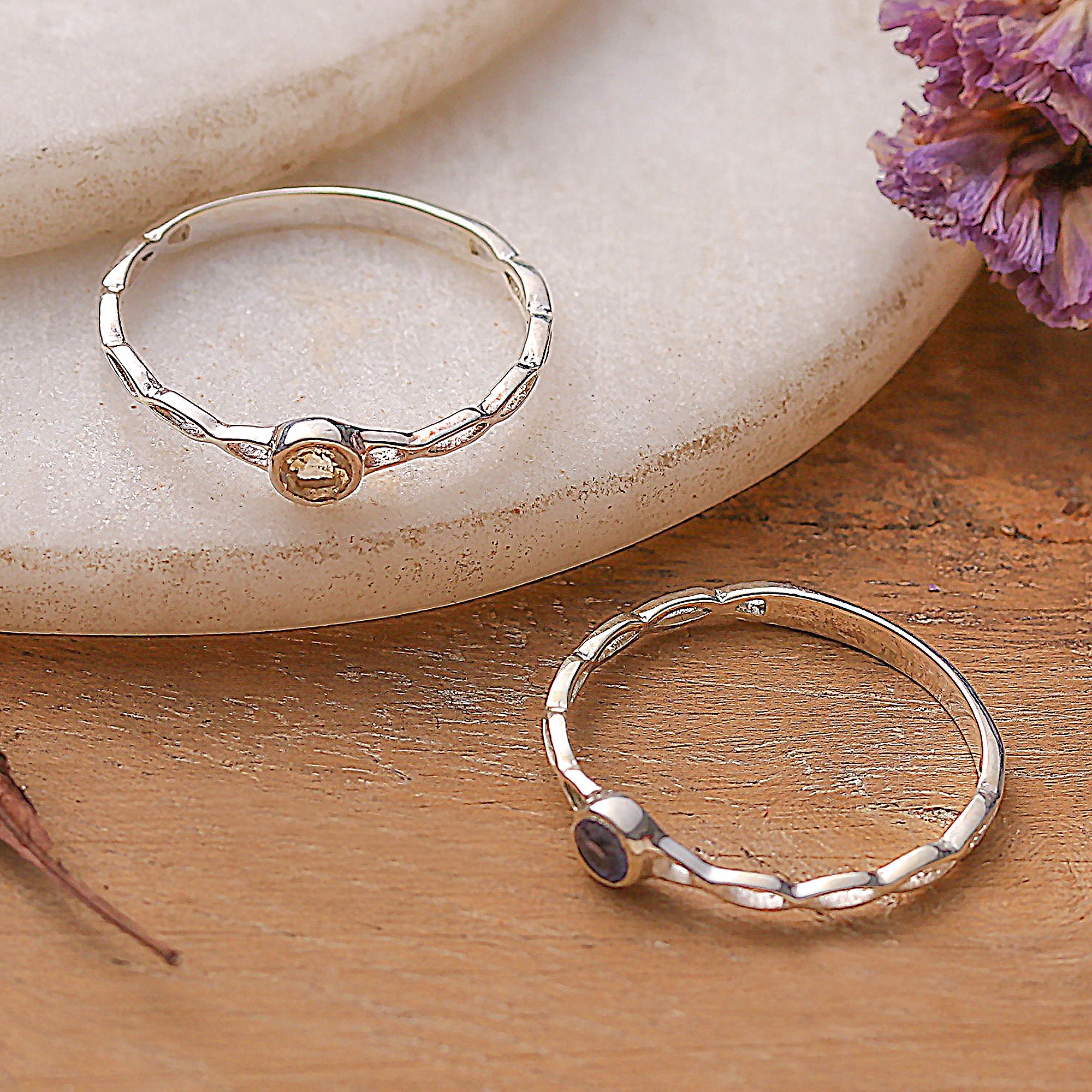 2 Citrine Blue Sapphire Silver Stacking Solitaire Rings, 'Dual Beauty'