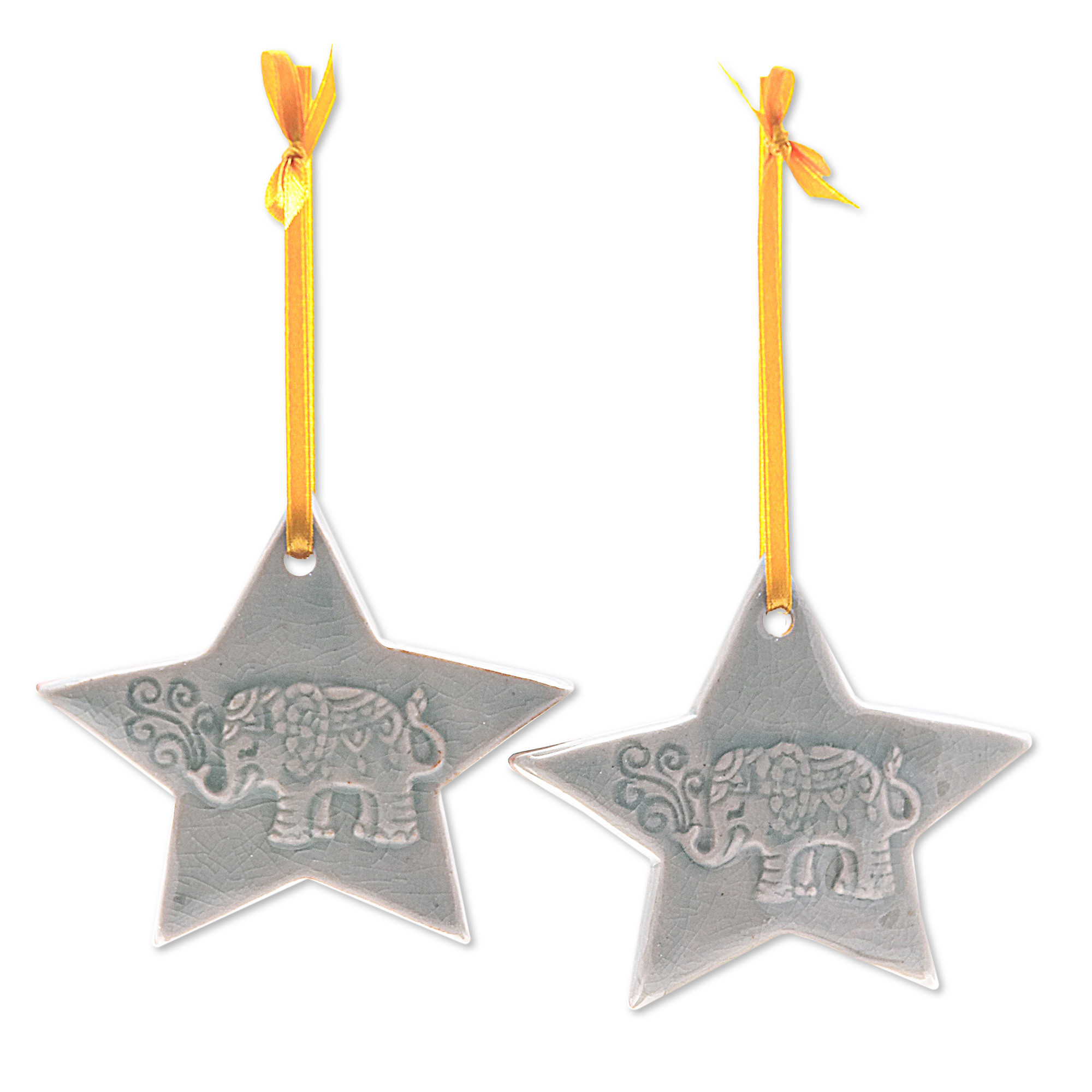 2 Elephant Star-Themed Celadon Ceramic Christmas Ornaments, 'Lucky Elephant Stars'