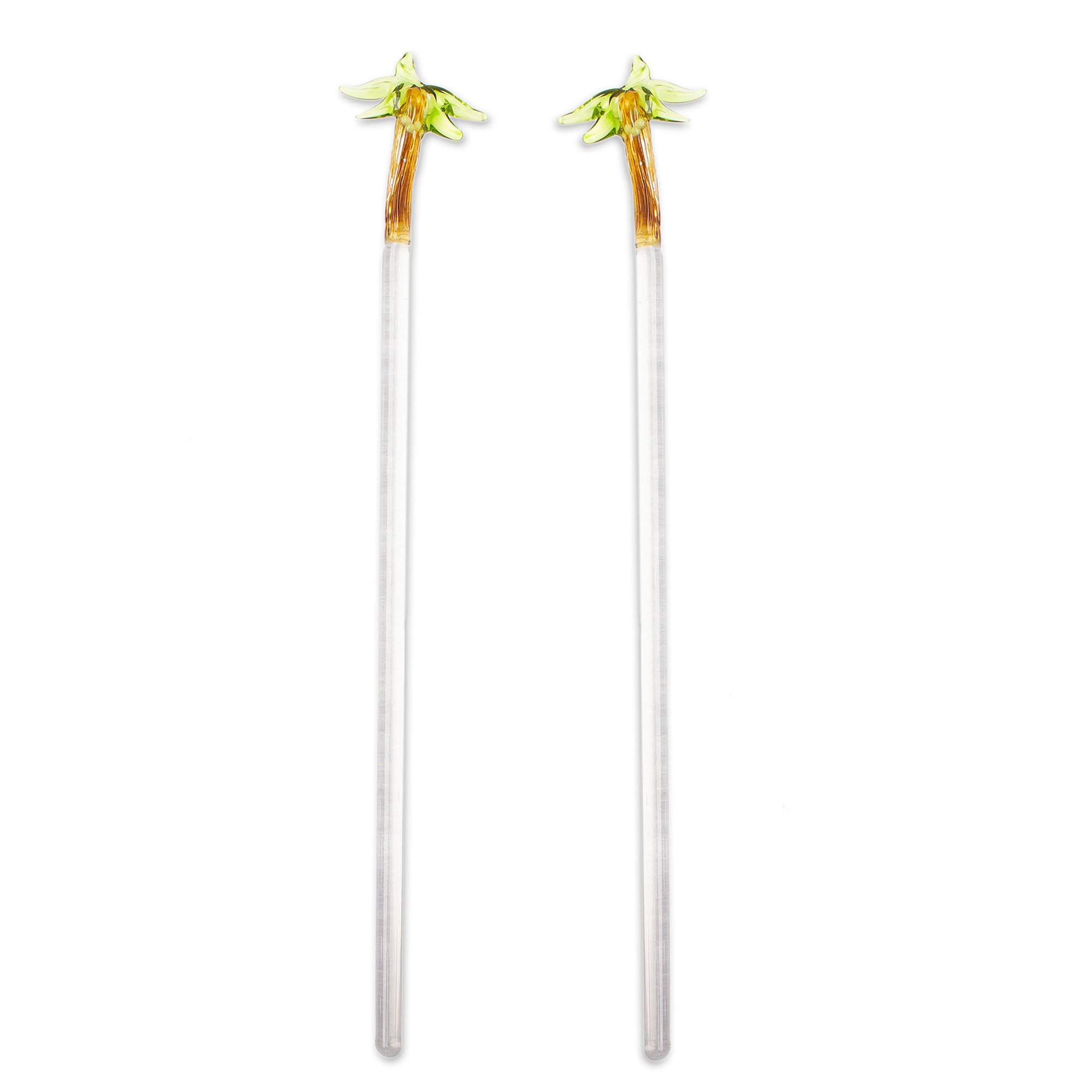 2 Handblown Recycled Glass Palm Tree Themed Drink Stirrers, 'Palm Tree Cheers'