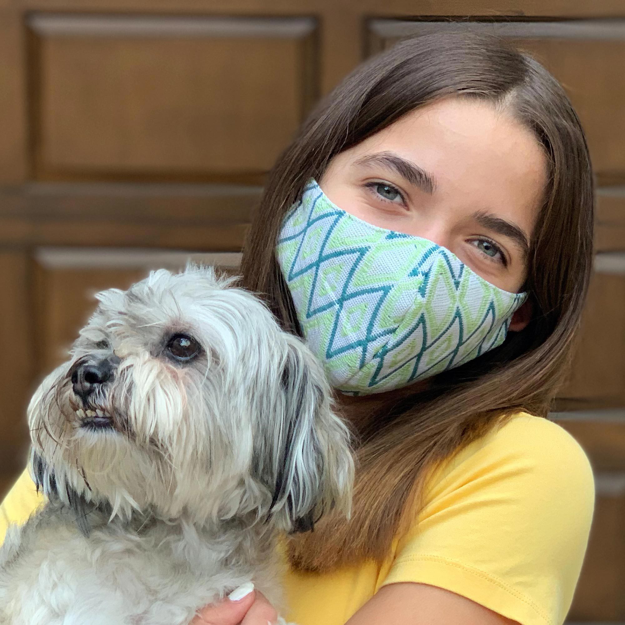 Elegant brocade motifs in greens on white are created on the backstrap loom. Designed by Emma Gutierrez, two handwoven face masks are contoured for comfort and fit. Each is fully lined and features a moisture-resistant interfacing for a total of three layers of fabric. The pair is both washable and reusable, with elastic to loop over the ears.