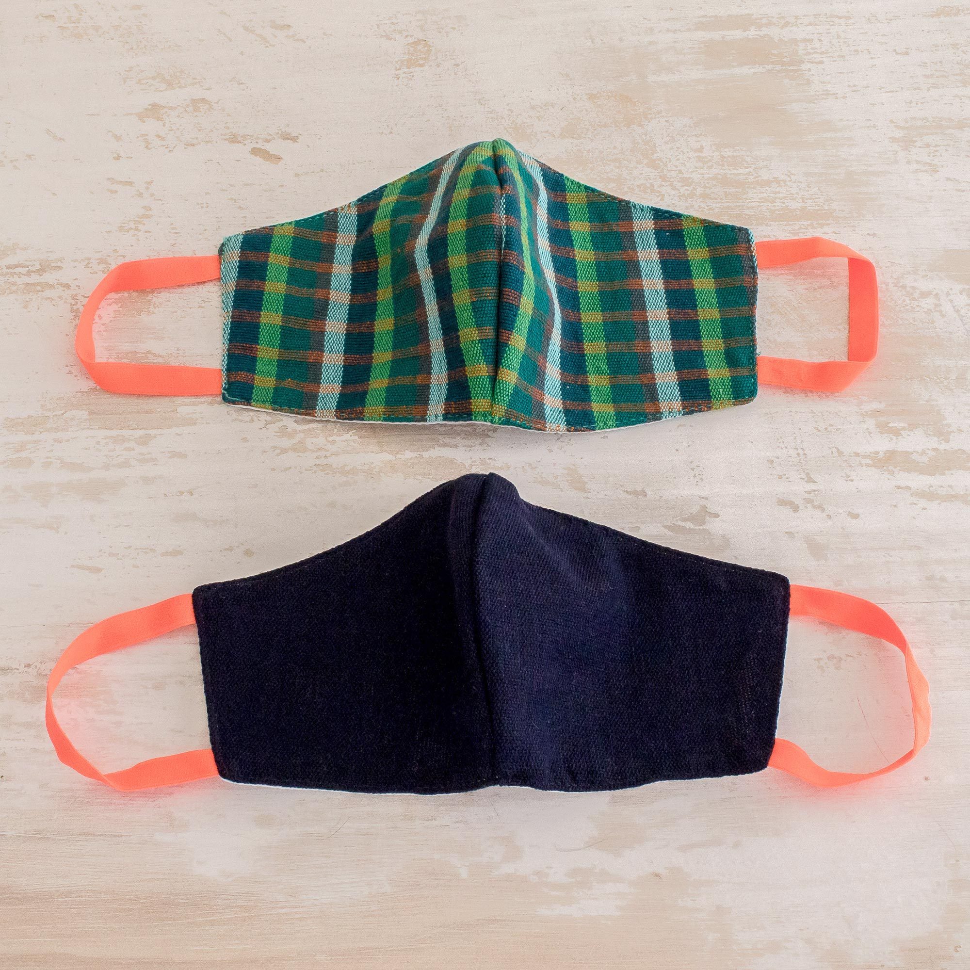 2 Handwoven Cotton Masks in Green Check & Solid Blue, 'Cheerful Squares'