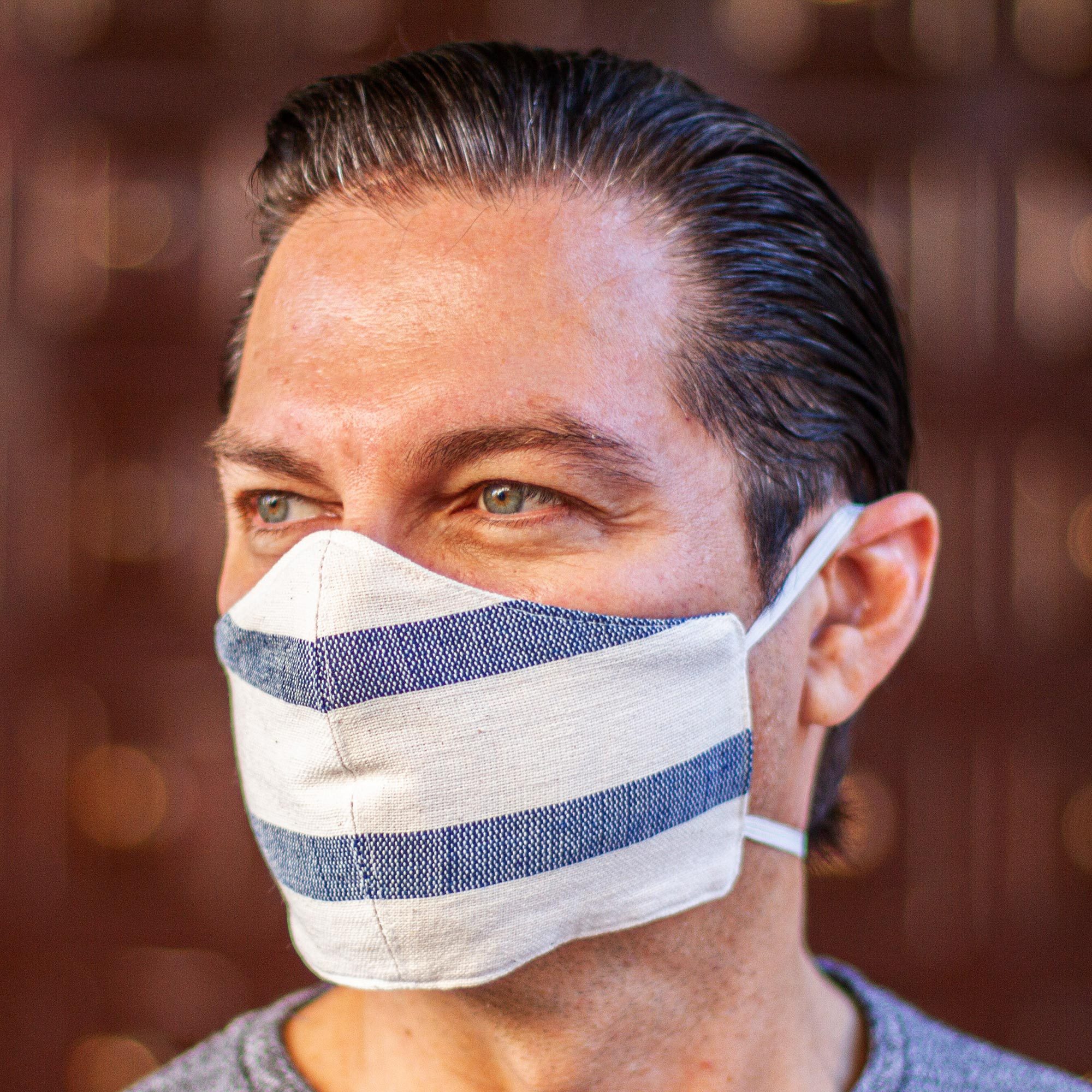 Quiet yet classic, blue stripes flow across an ivory background. Cool cotton is woven on a backstrap to become an attractive pair of face masks with unique handwoven textures. Artisans from Creative Hands of Oaxaca craft the contoured masks with elastic bands to stretch around the head. They are double-layered and are both washable and reusable.