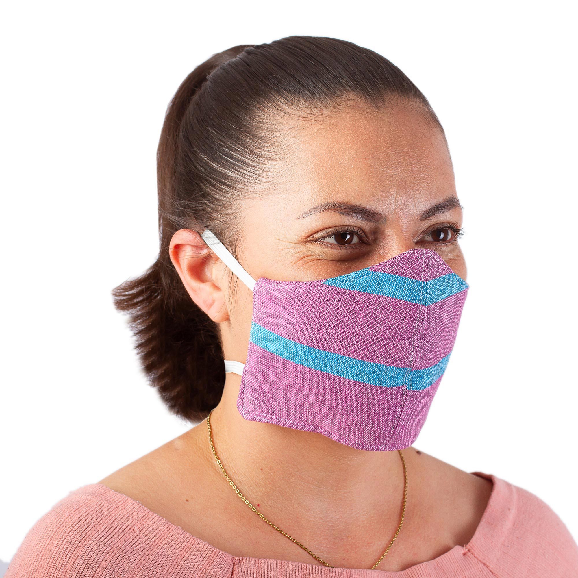Evoking the sky at dawn, light teal stripes flow across an amethyst-colored background. Colorful cotton is woven on a backstrap loom to become an attractive pair of face masks with unique handwoven textures. Artisans from Creative Hands of Oaxaca craft the contoured masks with elastic bands to stretch around the head. They are double-layered and are both washable and reusable.