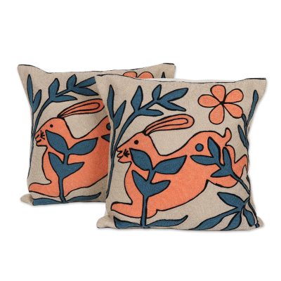 2 Rabbit Nature-Themed Chain-Stitched Cotton Cushion Covers, 'Playful Rabbits'