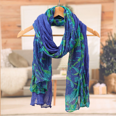Vivid green and rich blue come together in this striking pair of crinkled cotton scarves, offering endless ways to style them. Whether worn alone or layered, their airy texture and handwoven detail bring a casual elegance to any outfit. Finished with delicate fringes, each scarf carries the artistry of Thai artisan Vinita and the beauty of traditional batik tie-dyeing.