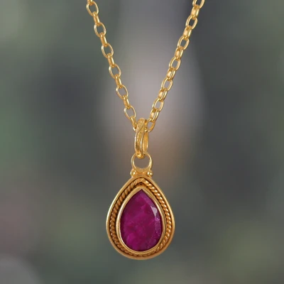 Let the heart of Indian artisan Bhavya Jain's pendant necklace ignite your look with its fiery essence. A single, pear-faceted ruby glows within its smooth gold-plated silver embrace, adorned with rope-like accents. This dazzling necklace is a bold focal point that draws the eye with its crimson shade and lustrous finish.