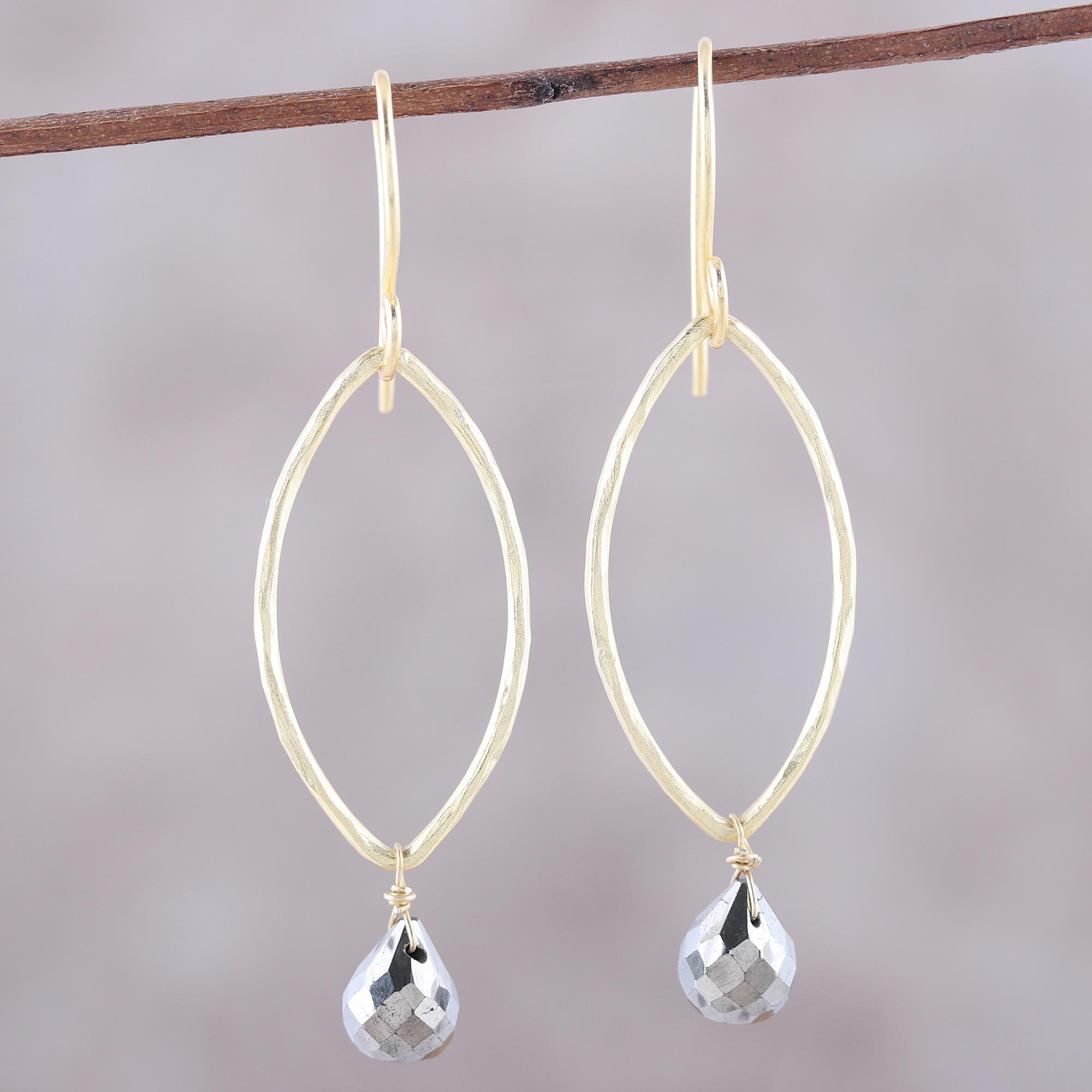 Gleaming with metallic hues, two faceted teardrops of natural pyrite are featured in this pair of dangle earrings from India. Vivek Nathany designs the earrings, which are crafted of sterling silver bathed in 22k gold.
