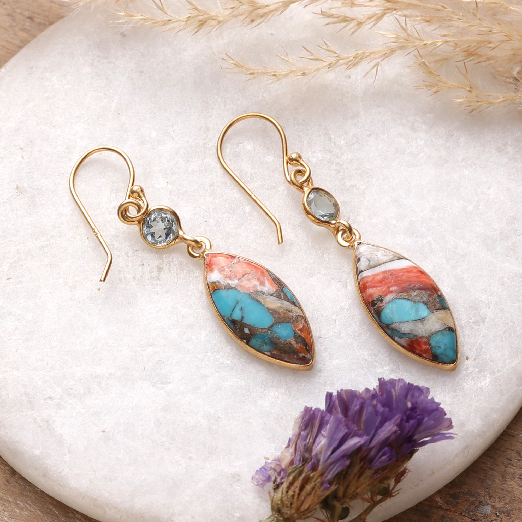 • 22k gold-plated 925 sterling silver, reconstituted turquoise, blue topaz