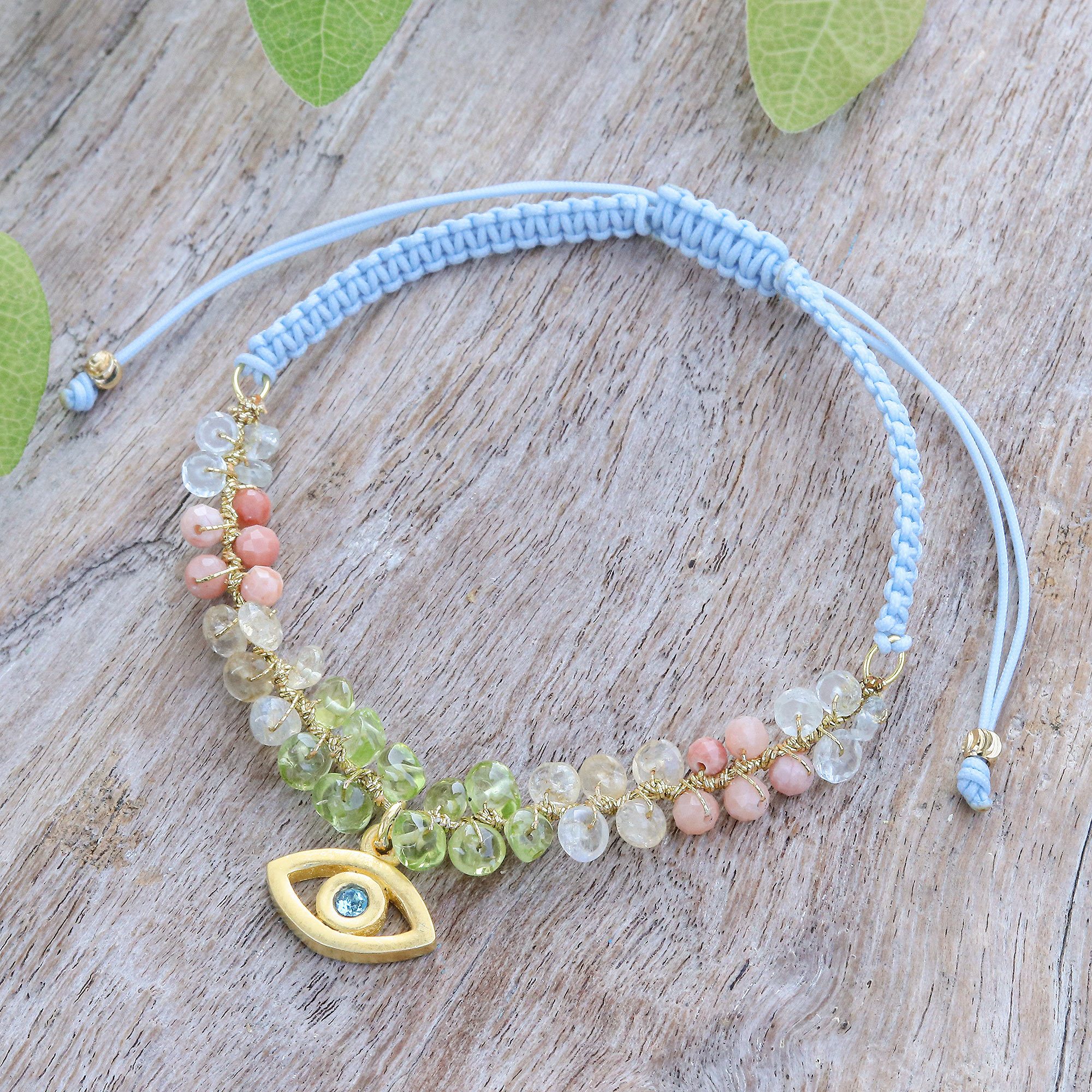24k Gold-Accented Multi-Gemstone Evil Eye Pendant Bracelet, 'Warding Eye'