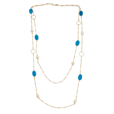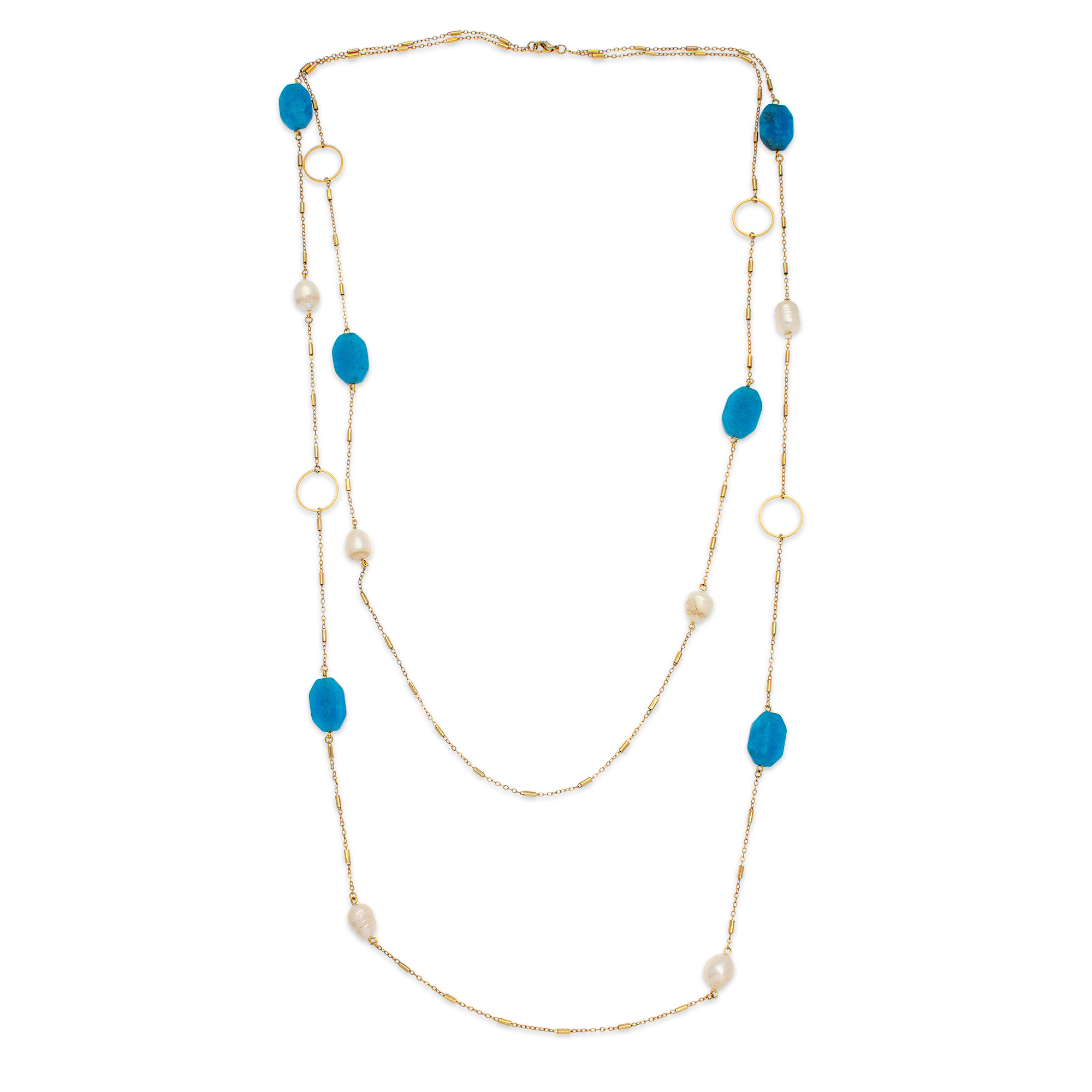 Blue agate gemstones invite refreshing energies to this distinguished piece from Mexico's ocean. Made by artisan Ali Guzman, this 24k gold-plated brass station necklace matches its precious agate with cultured pearls in a cream hue, a symbol of elegance and innocence.