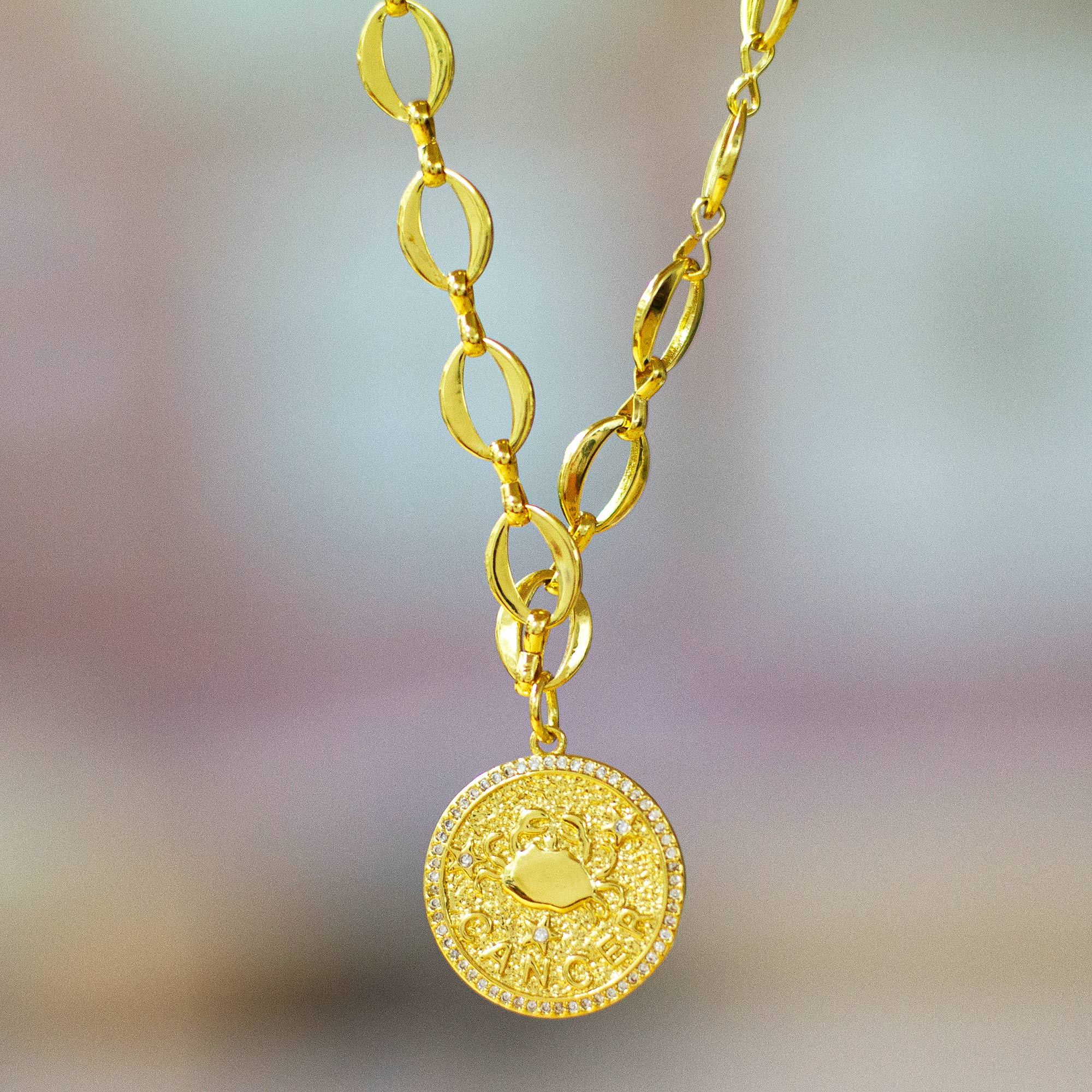 In astrology, Cancer is represented by the crab, a crustacean that lives between the sea and shore, symbolizing this zodiac sign's ability to adapt to both the emotional and material worlds. Mexican artisan Ali Guzman's splendid pendant necklace is meticulously crafted from 24k gold-plated brass, boasting delightful star motifs and gleaming cubic zirconia stones. Wear it as a radiant talisman, a symbol of your capability to navigate life's complexities with grace and resilience.