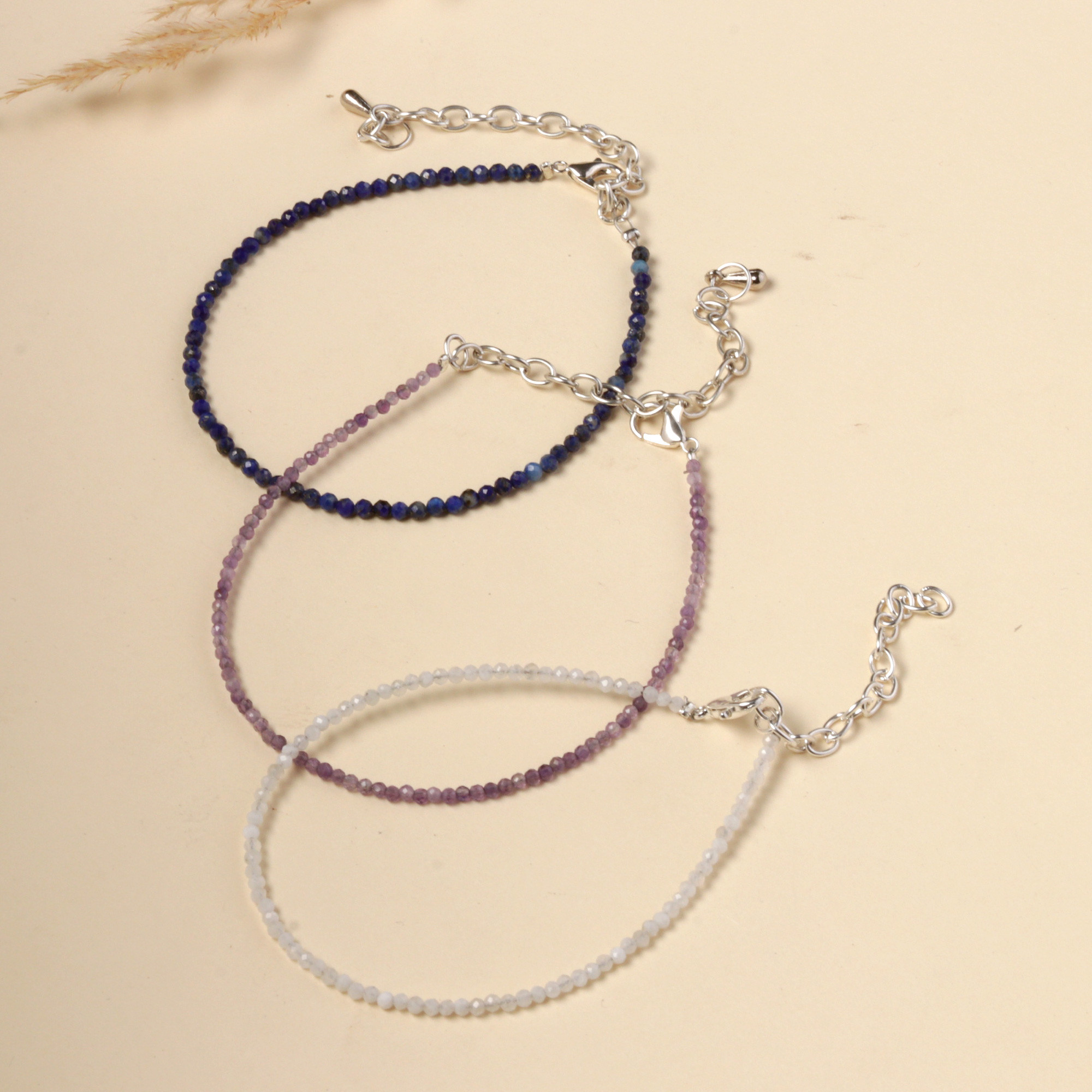 Indian designer Swasti Jain brings together the deep midnight blue of lapis lazuli, the soft lavender whisper of amethyst, and the barely-there shimmer of quartz into a trio of delicate beaded anklets that layer beautifully or hold their own worn solo. Each strand sits fine and close against the skin, threaded onto an adjustable iron rolo chain that makes a perfect fit from the sand to the sidewalk. Stack all three and let your ankles do the talking.