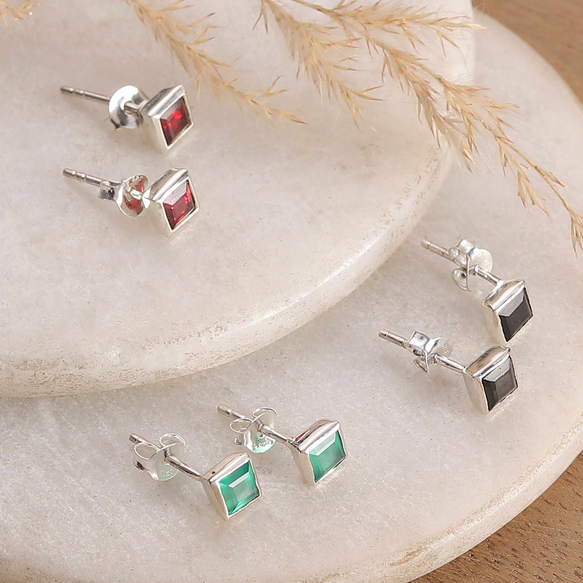 3-Piece 1-Carat Gemstone Stud Earrings Set Crafted in India, 'Precious Squares'