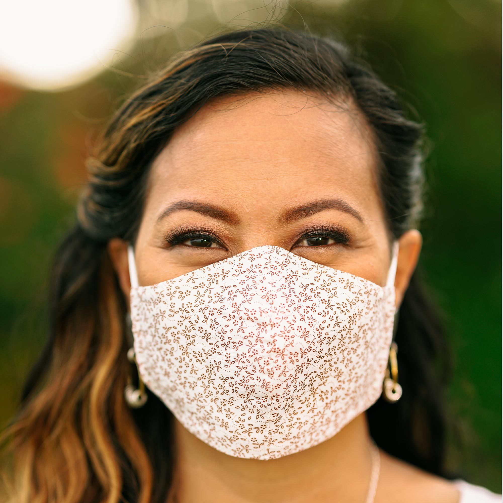 3 Pink-White-Sepia Print Ear Loop Cotton Face Masks Set, 'Rosy Dots and Posies'