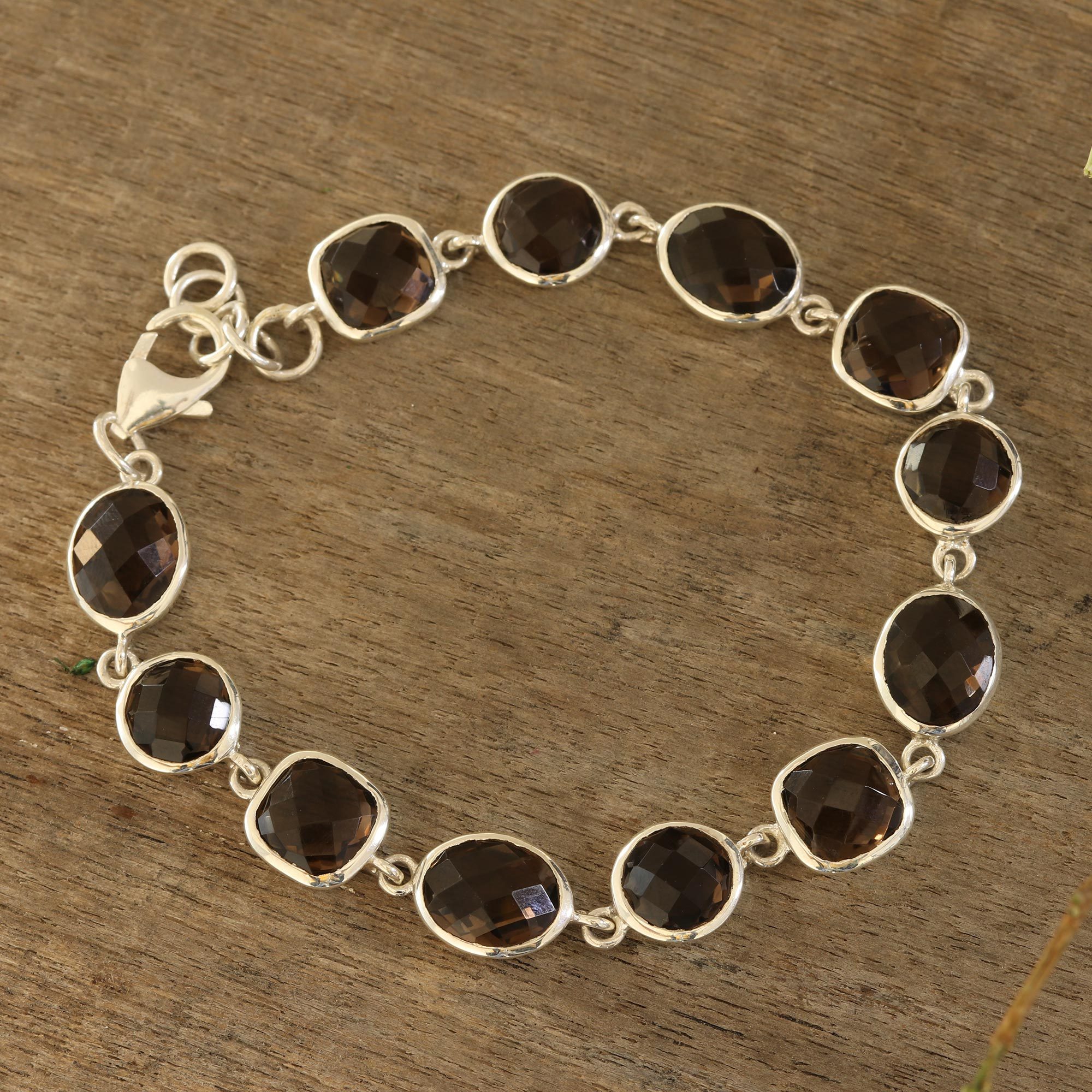 This fabulous bracelet is designed by Neetu Barathi in India. Faceted circles, ovals, and squares of lovely smoky quartz total over 30 carats, each gemstone framed by a link of high-polish sterling silver.